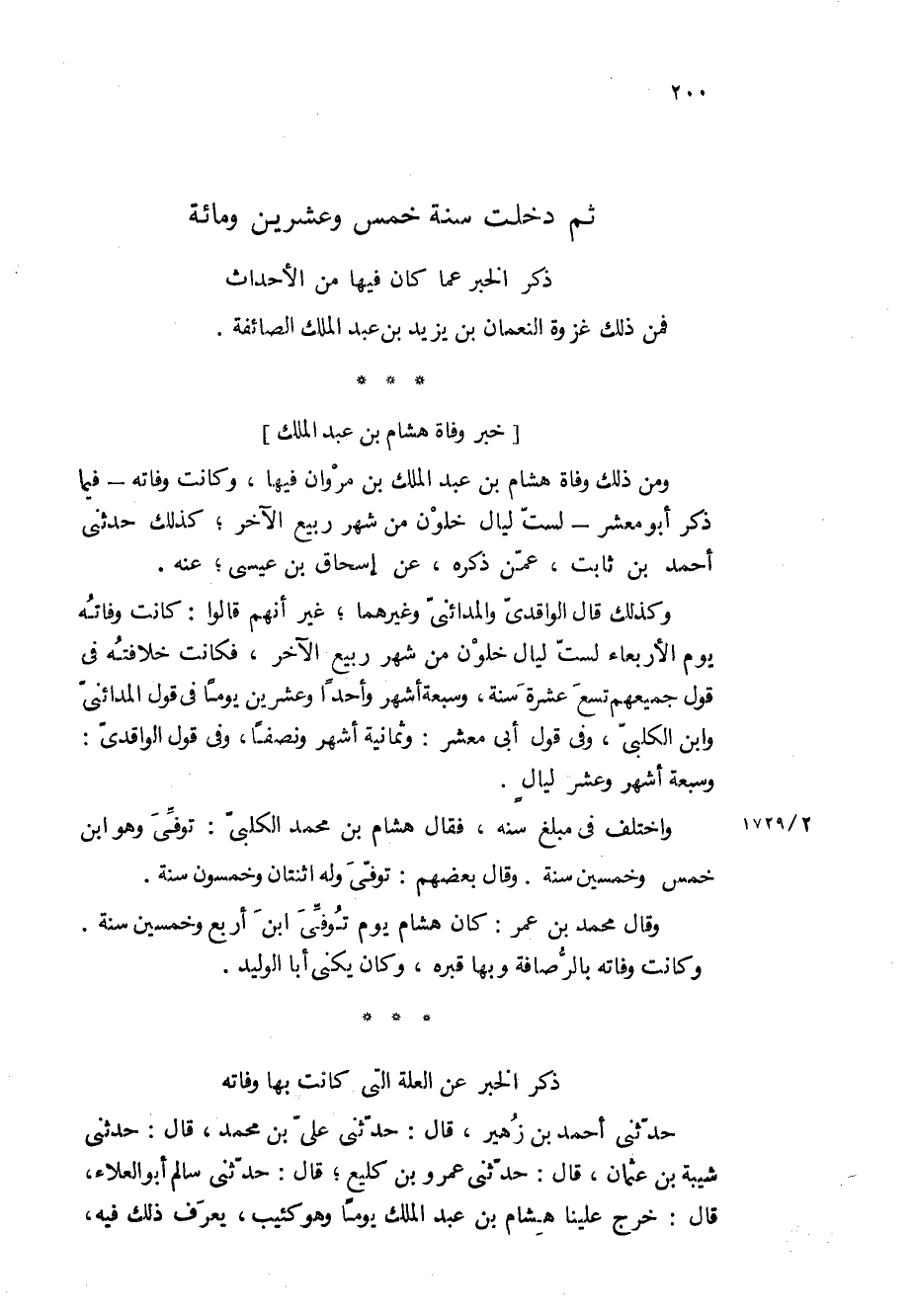 ومن ذلك وفاة هشام بْن عبد الملك بْن مروان فيها، وكانت وفاته- فيما ذكر أبو معشر- لست ليال خلون من شهر ربيع الآخر، كذلك حَدَّثَنِي أَحْمَدُ بْن ثَابِت، عمن ذكره، عن إسحاق بْن عيسى، عنه.