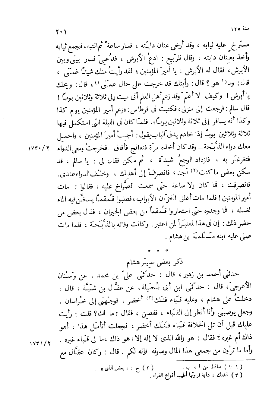 مسترخ عليه ثيابه، وقد أرخى عنان دابته، فسار ساعة ثم انتبه، فجمع ثيابه وأخذ بعنان دابته، وقال للربيع: ادع الأبرش، فدعي فسار بيني وبين الأبرش، فقال له الأبرش: يا أمير المؤمنين، لقد رأيت منك شيئا غمني، قَالَ: وما هو؟ قَالَ: رأيتك قد خرجت على حال غمني، قَالَ: ويحك يا أبرش! وكيف لا أغتم وقد زعم أهل العلم أني ميت إلى ثلاثة وثلاثين يوما! قَالَ سالم: فرجعت إلى منزلي، فكتبت في قرطاس: زعم أمير المؤمنين يوم كذا وكذا أنه يسافر إلى ثلاثة وثلاثين يوما فلما كان في الليلة التي استكمل فيها ثلاثة وثلاثين يوما إذا خادم يدق الباب يقول: أجب أمير المؤمنين، واحمل معك دواء الذبحة- وقد كان أخذه مرة فتعالج فأفاق- فخرجت ومعي الدواء فتغرغر به، فازداد الوجع شدة، ثم سكن فقال لي: يا سالم، قد سكن بعض ما كنت أجد، فانصرف إلى أهلك، وخلف الدواء عندي فانصرفت، فما كان إلا ساعة حتى سمعت الصراخ عليه، فقالوا: مات أمير المؤمنين! فلما مات أغلق الخزان الأبواب، فطلبوا قمقما يسخن فيه الماء لغسله، فما وجدوه حتى استعاروا قمقما من بعض الجيران، فقال بعض من حضر ذلك: إن في هذا لمعتبرا لمن اعتبر وكانت وفاته بالذبحة، فلما مات صلى عليه ابنه مسلمة بْن هشام.