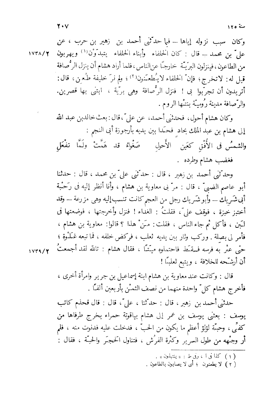 وكان سبب نزوله إياها- فيما حدثني أحمد بْن زهير بْن حرب، عن علي بْن محمد- قال: كان الخلفاء وأبناء الخلفاء يتبدون ويهربون من الطاعون، فينزلون البرية خارجا عن الناس، فلما أراد هشام أن ينزل الرصافة قيل له: لا تخرج، فإن الخلفاء لا يطعنون، ولم نر خليفة طعن، قَالَ: