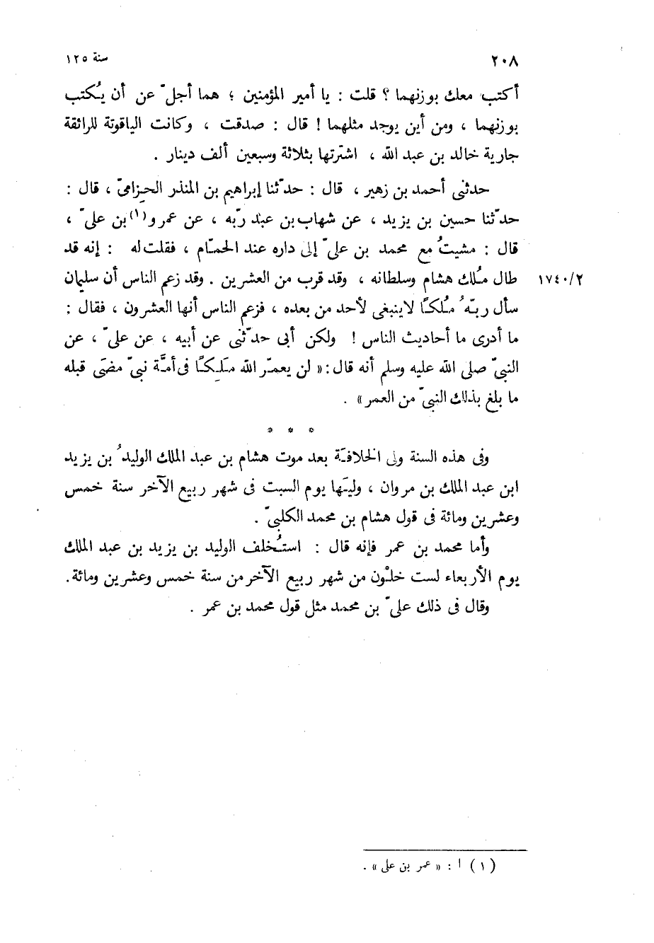 مَا أَدْرِي مَا أَحَادِيثُ النَّاسِ! وَلَكِنَّ أَبِي حَدَّثَنِي عَنْ ابيه، [عن على، عن النبي ص أَنَّهُ قَالَ: لَنْ يُعَمِّرَ اللَّهُ مُلْكًا فِي أُمَّةِ نَبِيٍّ مَضَى قَبْلَهُ مَا بَلَغَ بِذَلِكَ النَّبِيِّ مِنَ الْعُمُرِ] وفي هذه السنة وَلِيَ الْخِلافَةَ بَعْدَ مَوْتِ هِشَامِ بْنِ عَبْدِ الْمَلِكِ الوليد بن يزيد ابن عَبْدِ الْمَلِكِ بْنِ مَرْوَانَ، وَلِيَهَا يَوْمَ السَّبْتِ فِي شَهْرِ رَبِيعٍ الآخَرِ سَنَةَ خَمْسٍ وَعِشْرِينَ وَمِائَةٍ فِي قَوْلِ هِشَامِ بْنِ مُحَمَّدٍ الْكَلْبِيِّ.