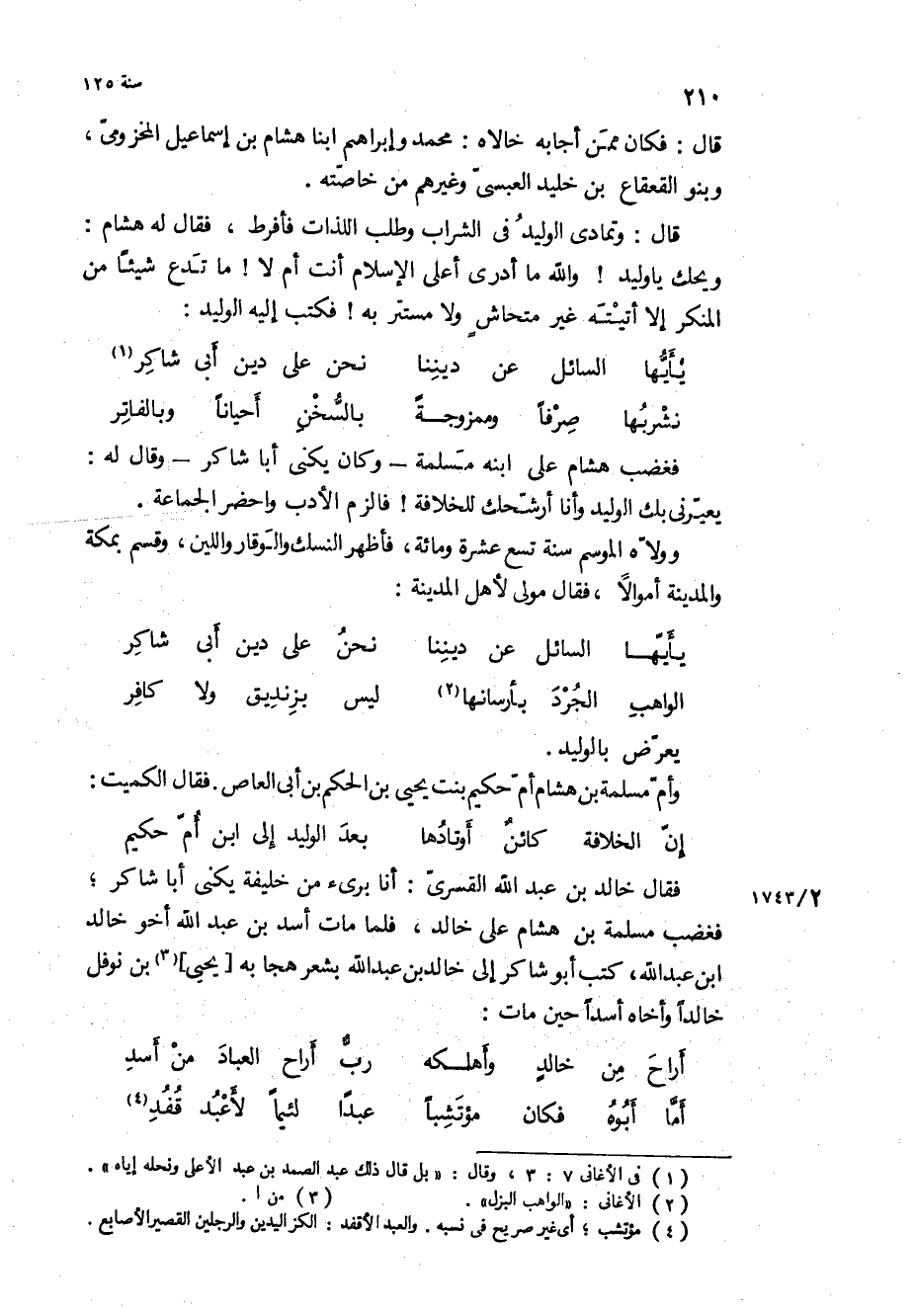 قَالَ: وتمادى الوليد في الشراب وطلب اللذات فأفرط، فقال له هشام: