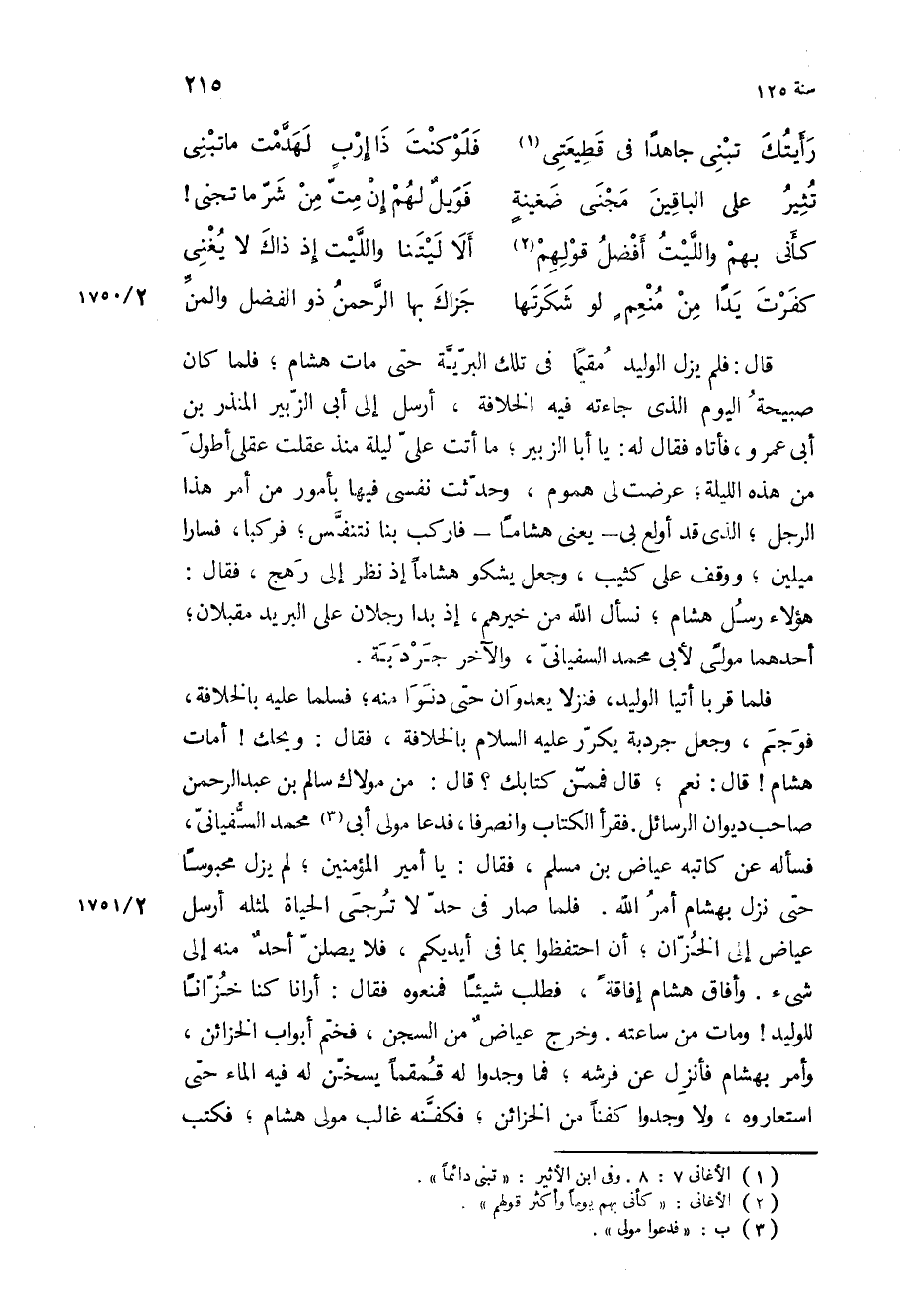 فلما قربا أتيا الوليد، فنزلا يعدوان حتى دنوا منه، فسلما عليه بالخلافة، فوجم، وجعل جردبة يكرر عليه السلام بالخلافة، فقال: ويحك! أمات هشام! قَالَ: نعم، قَالَ فممن كتابك؟ قَالَ: من مولاك سالم بْن عبد الرحمن صاحب ديوان الرسائل فقرا الكتاب وانصرفا، فدعا مولى أبي محمد السفياني فسأله عن كاتبه عياض بْن مسلم، فقال: يا أمير المؤمنين، لم يزل محبوسا حتى نزل بهشام أمر الله فلما صار في حد لا ترجى الحياة لمثله أرسل عياض إلى الخزان، أن احتفظوا بما في أيديكم، فلا يصلن أحد منه إلى شيء وأفاق هشام إفاقة، فطلب شيئا فمنعوه فقال: أرانا كنا خزانا للوليد! ومات من ساعته وخرج عياض من السجن، فختم أبواب الخزائن، وأمر بهشام فأنزل عن فرشه، فما وجدوا له قمقما يسخن له فيه الماء حتى استعاروه، ولا وجدوا كفنا من الخزائن، فكفنه غالب مولى هشام، فكتب