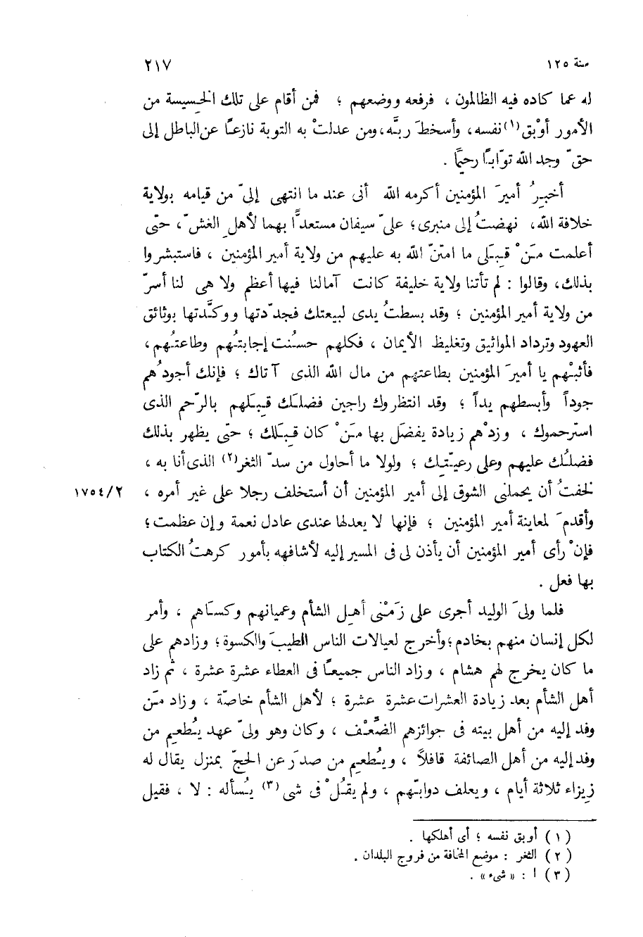 أخبر أمير المؤمنين أكرمه الله انى عند ما انتهى إلي من قيامه بولاية خلافة الله، نهضت الى منبري، على سيفان مستعدا بهما لأهل الغش، حتى أعلمت من قبلي ما امتن الله به عليهم من ولاية أمير المؤمنين، فاستبشروا بذلك، وقالوا: لم تأتنا ولاية خليفة كانت آمالنا فيها أعظم ولا هي لنا أسر من ولاية أمير المؤمنين، وقد بسطت يدي لبيعتك فجددتها ووكدتها بوثائق العهود وترداد المواثيق وتغليظ الأيمان، فكلهم حسنت إجابتهم وطاعتهم، فأثبهم يا أمير المؤمنين بطاعتهم من مال الله الذي آتاك، فإنك أجودهم جودا وأبسطهم يدا، وقد انتظروك راجين فضلك قبلهم بالرحم الذي استرحموك، وزدهم زيادة يفضل بها من كان قبلك، حتى يظهر بذلك فضلك عليهم وعلى رعيتك، ولولا ما أحاول من سد الثغر الذي أنا به، لخفت أن يحملني الشوق إلى أمير المؤمنين أن أستخلف رجلا على غير أمره، وأقدم لمعاينة أمير المؤمنين، فإنها لا يعدلها عندي عادل نعمة وإن عظمت، فإن رأى أمير المؤمنين أن يأذن لي في المسير إليه لأشافهه بأمور كرهت الكتاب بها فعل.