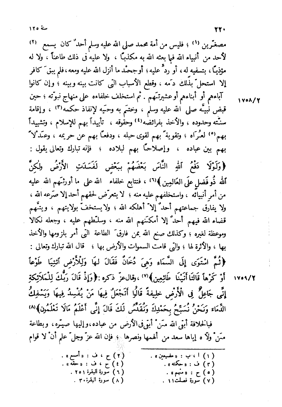 «وَلَوْلا دَفْعُ اللَّهِ النَّاسَ بَعْضَهُمْ بِبَعْضٍ لَفَسَدَتِ الْأَرْضُ وَلكِنَّ اللَّهَ ذُو فَضْلٍ عَلَى الْعالَمِينَ» ، فتتابع خلفاء الله على ما أورثهم الله عليه من أمر أنبيائه، واستخلفهم عليه منه، لا يتعرض لحقهم أحد إلا صرعه الله، ولا يفارق جماعتهم أحد إلا أهلكه الله، ولا يستخف بولايتهم، ويتهم قضاء الله فيهم أحد إلا أمكنهم الله منه، وسلطهم عليه، وجعله نكالا وموعظة لغيره، وكذلك صنع الله بمن فارق الطاعة التي أمر بلزومها والأخذ بها، والأثرة لها، والتي قامت السموات والارض بها، قَالَ الله تبارك وتعالى: