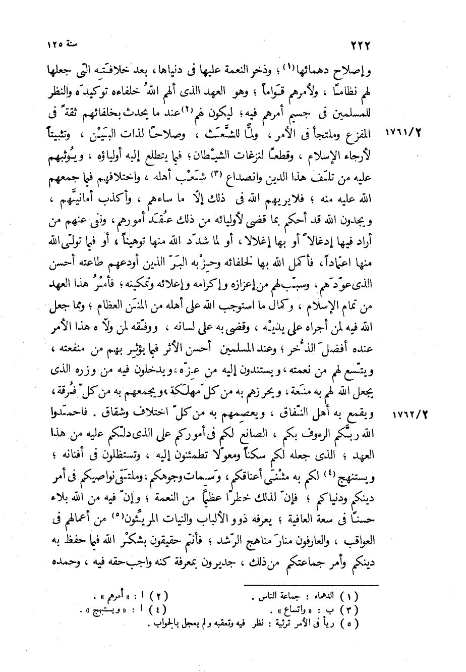 وإصلاح دهمائها، وذخر النعمة عليها في دنياها، بعد خلافته التي جعلها لهم نظاما، ولأمرهم قواما، وهو العهد الذي ألهم الله خلفاءه توكيده والنظر للمسلمين في جسيم أمرهم فيه، ليكون لهم عند ما يحدث بخلفائهم ثقة في المفزع وملتجأ في الأمر، ولما للشعث، وصلاحا لذات البين، وتثبيتا لأرجاء الإسلام، وقطعا لنزغات الشيطان، فيما يتطلع إليه أولياؤه، ويوثبهم عليه من تلف هذا الدين وانصداع شعب أهله، واختلافهم فيما جمعهم الله عليه منه، فلا يريهم الله في ذلك إلا ما ساءهم، وأكذب أمانيهم، ويجدون الله قد أحكم بما قضى لأوليائه من ذلك عقد أمورهم، ونفى عنهم من أراد فيها إدغالا أو بها إغلالا، أو لما شدد الله منها توهينا، أو فيما تولى الله منها اعتمادا، فأكمل الله بها لخلفائه وحزبه البر الذين أودعهم طاعته أحسن الذي عودهم، وسبب لهم من إعزازه وإكرامه وإعلائه وتمكينه، فأمر هذا العهد من تمام الإسلام وكمال ما استوجب الله على أهله من المنن العظام، ومما جعل الله فيه لمن أجراه على يديه، وقضى به على لسانه، ووفقه لمن ولاه هذا الأمر عنده أفضل الذخر، وعند المسلمين أحسن الأثر فيما يؤثر بهم من منفعته، ويتسع لهم من نعمته، ويستندون إليه من عزه، ويدخلون فيه من وزره الذى يجعل الله لهم به منعة، ويحرزهم به من كل مهلكة، ويجمعهم به من كل فرقة، ويقمع به أهل النفاق، ويعصمهم به من كل اختلاف وشقاق فاحمدوا الله ربكم الرءوف بكم، الصانع لكم في أموركم على الذي دلكم عليه من هذا العهد، الذي جعله لكم سكنا ومعولا تطمئنون إليه، وتستظلون في أفنانه، ويستنهج لكم به مثنى أعناقكم، وسمات وجوهكم، وملتقى نواصيكم في أمر دينكم ودنياكم، فإن لذلك خطرا عظيما من النعمة، وإن فيه من الله بلاء حسنا في سعة العافيه، يعرفه ذوو الألباب والنيات المريئون من أعمالهم في العواقب، والعارفون منار مناهج الرشد، فأنتم حقيقون بشكر الله فيما حفظ به دينكم وأمر جماعتكم من ذلك، جديرون بمعرفة كنه واجب حقه فيه، وحمده
