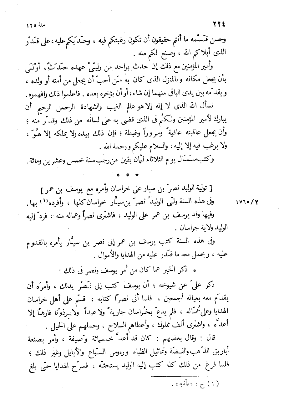 وفي هذه السنة كتب يوسف بْن عمر إلى نصر بْن سيار يأمره بالقدوم عليه، ويحمل معه ما قدر عليه من الهدايا والأموال.