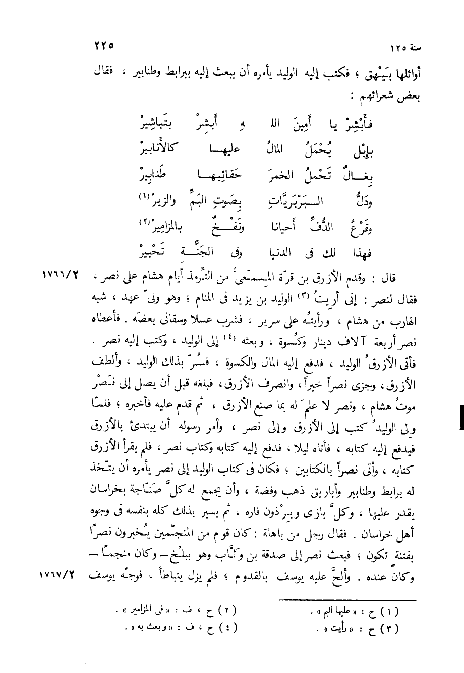 قَالَ: وقدم الأزرق بْن قرة المسمعي من الترمذ أيام هشام على نصر، فقال لنصر: إني أريت الوليد بْن يزيد في المنام، وهو ولي عهد، شبه الهارب من هشام، ورأيته على سرير، فشرب عسلا وسقاني بعضه فأعطاه نصر أربعة آلاف دينار وكسوه، وبعثه الى الوليد، وكتب اليه نصر فأتى الأزرق الوليد، فدفع إليه المال والكسوة، فسر بذلك الوليد، وألطف الأزرق، وجزى نصرا خيرا، وانصرف الأزرق، فبلغه قبل أن يصل إلى نصر موت هشام، ونصر لا علم له بما صنع الأزرق، ثم قدم عليه فأخبره، فلما ولي الوليد كتب إلى الأزرق وإلى نصر، وأمر رسوله أن يبتدئ بالأزرق فيدفع إليه كتابه، فأتاه ليلا، فدفع إليه كتابه وكتاب نصر، فلم يقرأ الأزرق كتابه، واتى نصرا بالكتابين، فكان في كتاب الوليد إلى نصر يأمره أن يتخذ له برابط وطنابير وأباريق ذهب وفضة، وأن يجمع له كل صناجة بخراسان يقدر عليها، وكل بازي وبرذون فاره، ثم يسير بذلك كله بنفسه في وجوه أهل خراسان فقال رجل من باهلة: كان قوم من المنجمين يخبرون نصرا بفتنة تكون، فبعث نصر إلى صدقة بْن وثاب وهو ببلخ- وكان منجما- وكان عنده وألح عليه يوسف بالقدوم، فلم يزل يتباطأ، فوجه يوسف
