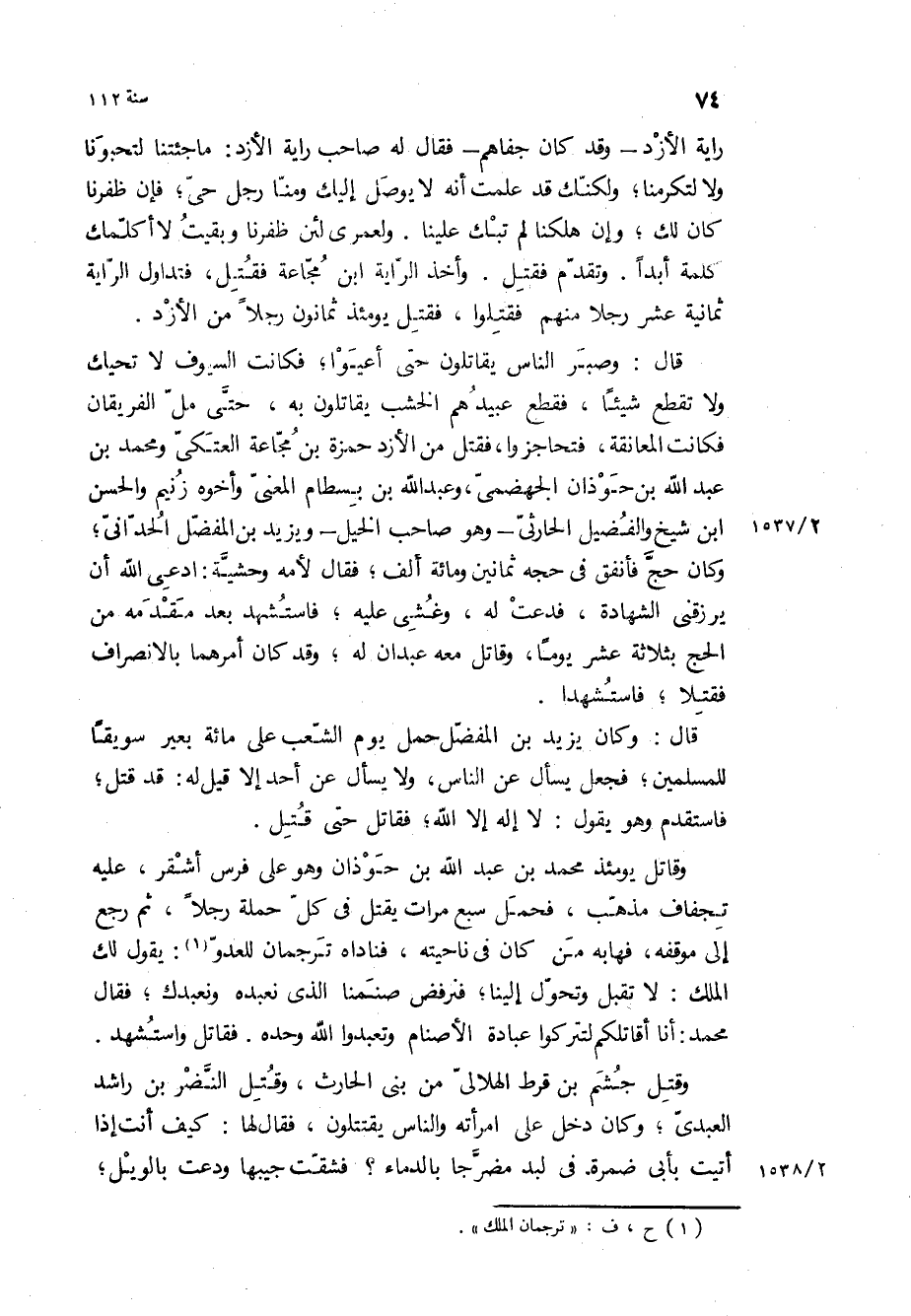 قَالَ: وصبر الناس يقاتلون حتى أعيوا، فكانت السيوف لا تحيك ولا تقطع شيئا، فقطع عبيدهم الخشب يقاتلون به، حتى مل الفريقان فكانت المعانقة، فتحاجزوا، فقتل من الأزد حمزة بْن مجاعة العتكي ومحمد بْن عبد الله بْن حوذان الجهضمي، وعبد الله بْن بسطام المعني واخوه زنيم والحسن ابن شيخ والفضيل الحارثي- وهو صاحب الخيل- ويزيد بْن المفضل الحداني، وكان حج فأنفق في حجة ثمانين ومائة ألف، فقال لأمه وحشية: ادعي الله أن يرزقني الشهادة، فدعت له، وغشي عليه، فاستشهد بعد مقدمه من الحج بثلاثة عشر يوما، وقاتل معه عبدان له، وقد كان أمرهما بالانصراف فقتلا، فاستشهدا.