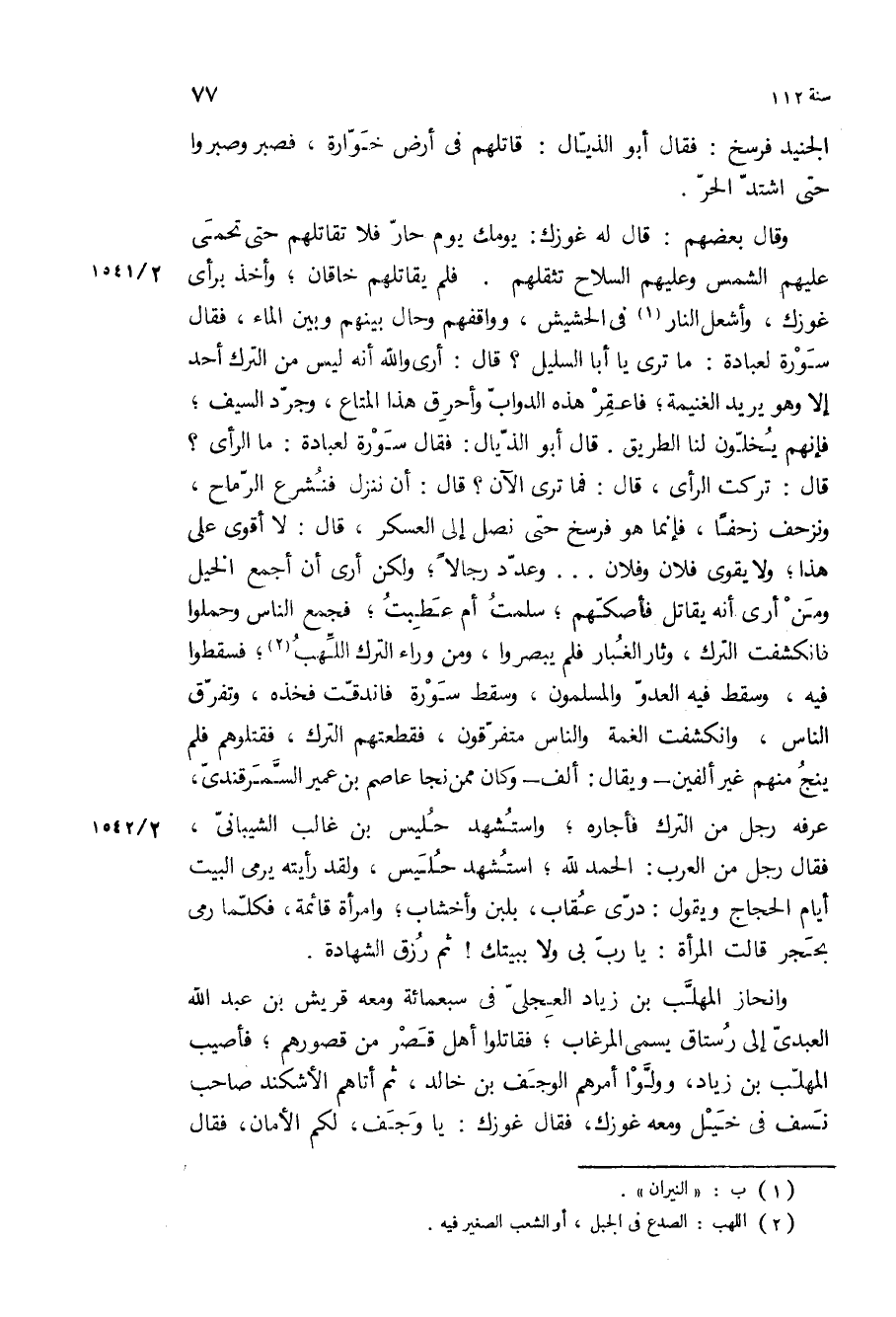 في ارض خواره، فصبر وصبروا حتى اشتد الحر وقَالَ بعضهم: قَالَ له غوزك: يومك يوم حار فلا تقاتلهم حتى تحمى عليهم الشمس وعليهم السلاح تثقلهم فلم يقاتلهم خاقان، وأخذ برأي غوزك، وأشعل النار في الحشيش، وواقفهم وحال بينهم وبين الماء، فقال سورة لعبادة: ما ترى يا أبا السليل؟ قَالَ: أرى والله أنه ليس من الترك أحد إلا وهو يريد الغنيمة، فاعقر هذه الدواب وأحرق هذا المتاع، وجرد السيف، فإنهم يخلون لنا الطريق قَالَ أبو الذيال: فقال سورة لعبادة: ما الرأي؟