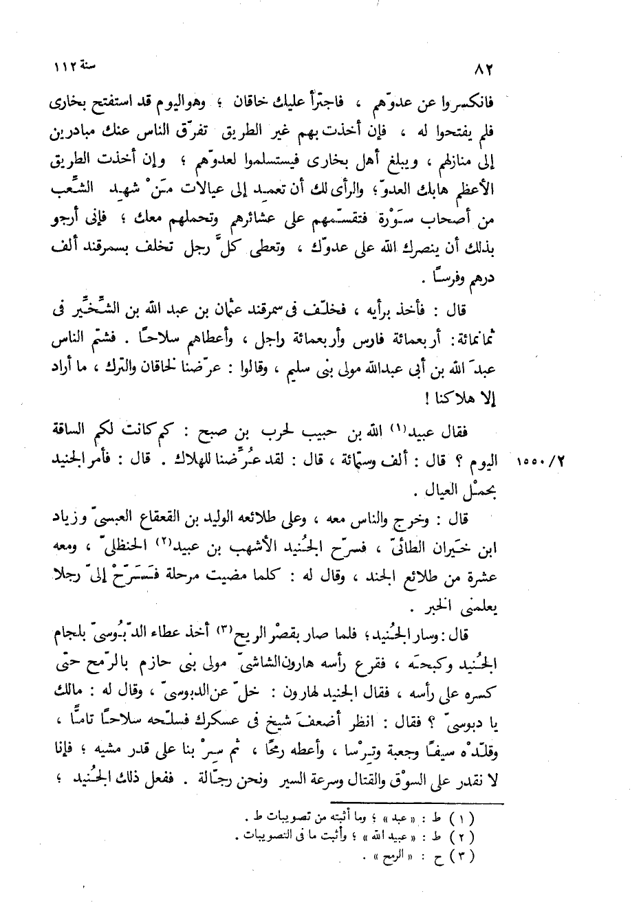 قَالَ: وسار الجنيد، فلما صار بقصر الريح أخذ عطاء الدبوسي بلجام الجنيد وكبحه، فقرع رأسه هارون الشاشي مولى بني حازم بالرمح حتى كسره على رأسه، فقال الجنيد لهارون: خل عن الدبوسي، وقال له: ما لك يا دبوسي؟ فقال: انظر أضعف شيخ في عسكرك فسلحه سلاحا تاما، وقلده سيفا وجعبة وترسا، وأعطه رمحا، ثم سر بنا على قدر مشيه، فإنا لا نقدر على السوق والقتال وسرعة السير ونحن رجالة ففعل ذلك الجنيد،
