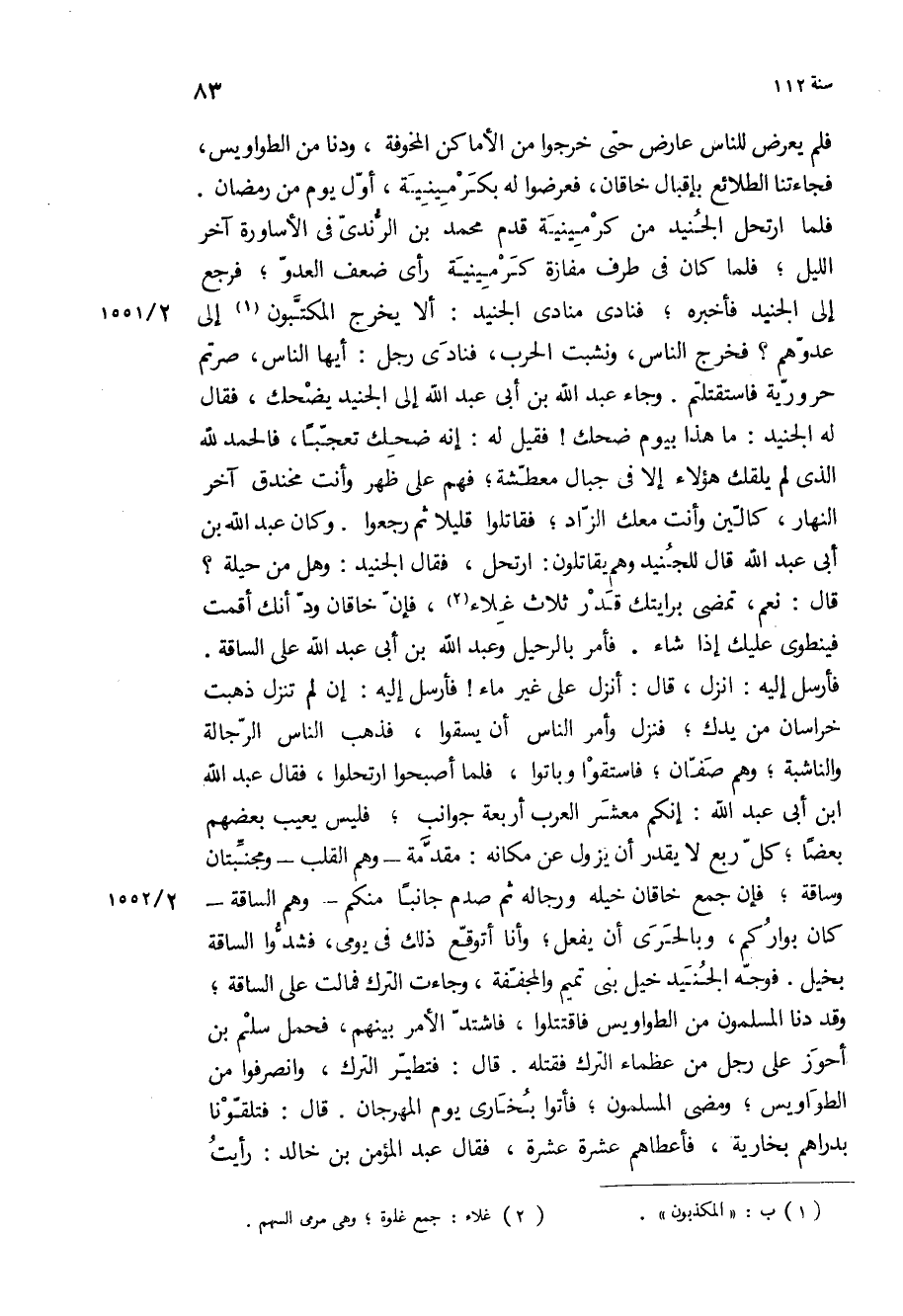 فأرسل إليه: انزل، قَالَ: أنزل على غير ماء! فأرسل إليه: إن لم تنزل ذهبت خراسان من يدك، فنزل وأمر الناس أن يسقوا، فذهب الناس الرجالة والناشبة، وهم صفان، فاستقوا وباتوا، فلما أصبحوا ارتحلوا، فقال عبد الله ابن أبي عبد الله: إنكم معشر العرب أربعة جوانب، فليس يعيب بعضهم بعضا، كل ربع لا يقدر أن يزول عن مكانه: مقدمة- وهم القلب- ومجنبتان وساقة، فإن جمع خاقان خيله ورجاله ثم صدم جانبا منكم- وهم الساقة- كان بواركم، وبالحري أن يفعل، وأنا أتوقع ذلك في يومي، فشدوا الساقة بخيل فوجه الجنيد خيل بني تميم والمجففة، وجاءت الترك فمالت على الساقة، وقد دنا المسلمون من الطواويس فاقتتلوا، فاشتد الأمر بينهم، فحمل سلم بْن أحوز على رجل من عظماء الترك فقتله قَالَ: فتطير الترك، وانصرفوا من الطواويس، ومضى المسلمون، فأتوا بخارى يوم المهرجان قَالَ: فتلقونا بدراهم بخارية، فأعطاهم عشرة عشرة، فقال عبد المؤمن بْن خالد: رأيت