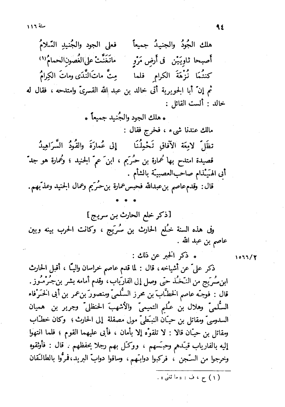 قَالَ: وقدم عاصم بْن عبد الله فحبس عماره بن حريم وعمال الجنيد وعذبهم