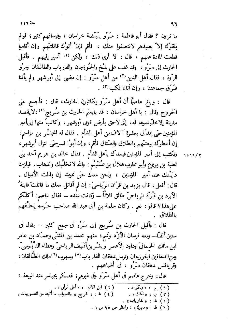 قَالَ: وأقبل الحارث بْن سريج إلى مرو في جمع كثير- يقال في ستين ألفا- ومعه فرسان الأزد وتميم، منهم محمد بْن المثنى وحماد بْن عامر ابن مالك الحماني وداود الأعسر وبشر بْن أنيف الرياحي وعطاء الدبوسي.