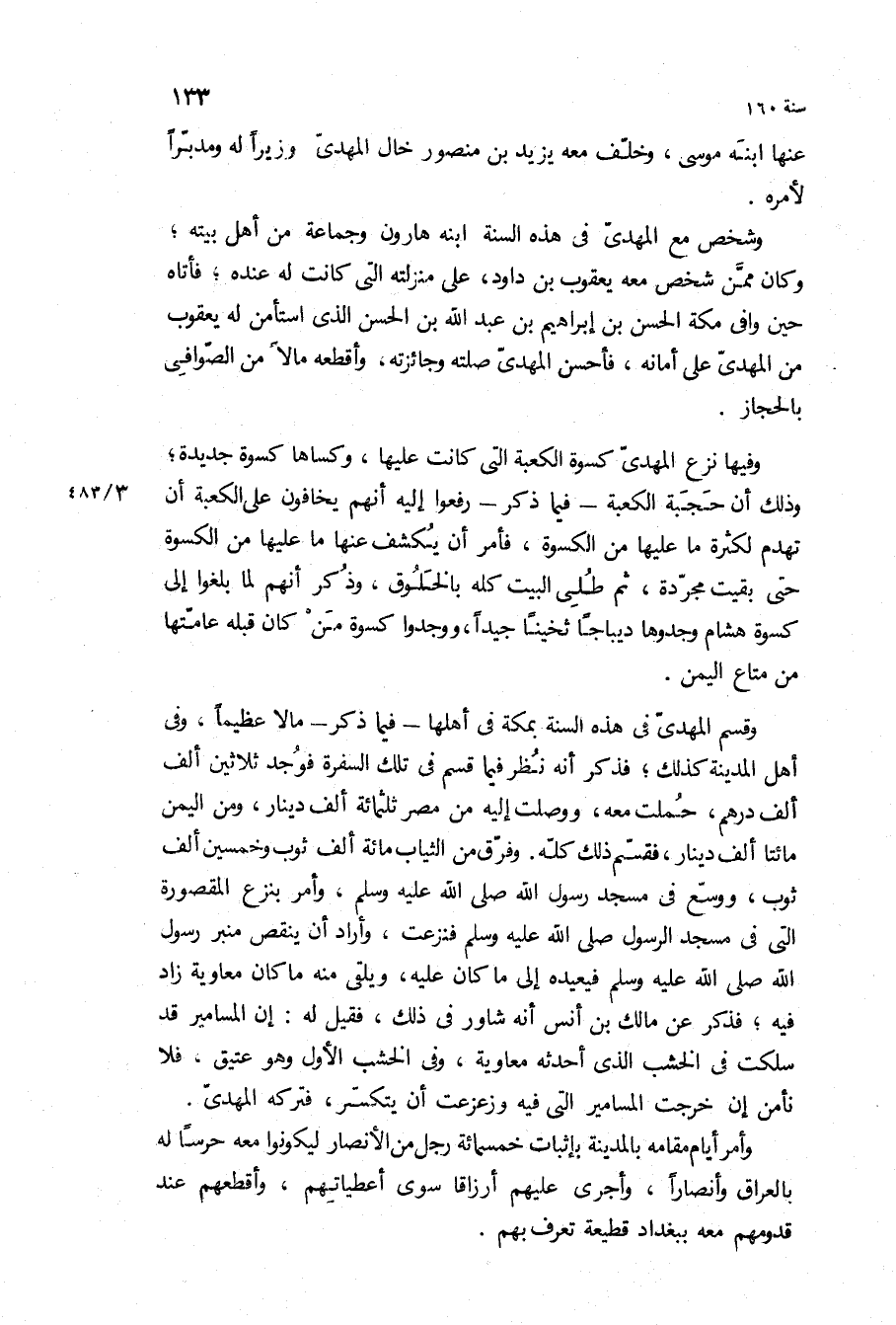 وفيها نزع المهدي كسوة الكعبة التي كانت عليها، وكساها كسوة جديدة، وذلك أن حجبة الكعبة- فيما ذكر- رفعوا إليه أنهم يخافون على الكعبة أن تهدم لكثرة ما عليها من الكسوة، فأمر أن يكشف عنها ما عليها من الكسوة حتى بقيت مجرده، ثم طلى البيت كله بالخلوق، وذكر أنهم لما بلغوا إلى كسوة هشام وجدوها ديباجا ثخينا جيدا، ووجدوا كسوة من كان قبله عامتها من متاع اليمن.