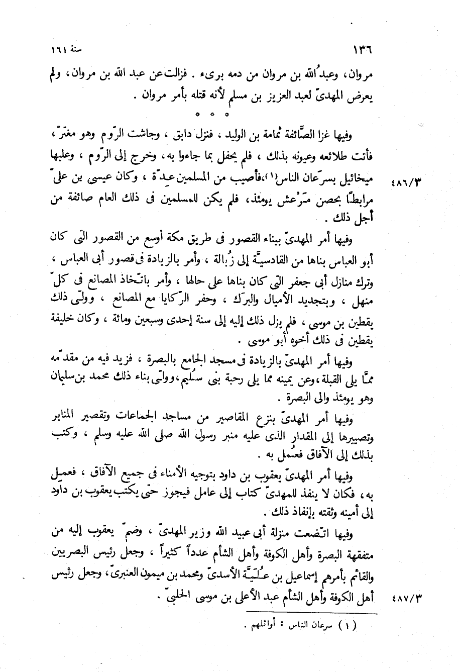 وفيها أمر المهدي ببناء القصور في طريق مكة أوسع من القصور التي كان أبو العباس بناها من القادسية إلى زبالة، وأمر بالزيادة في قصور أبي العباس، وترك منازل أبي جعفر التي كان بناها على حالها، وأمر باتخاذ المصانع في كل منهل، وبتجديد الأميال والبرك، وحفر الركايا مع المصانع، وولى ذلك يقطين بْن موسى، فلم يزل ذلك إليه إلى سنة إحدى وسبعين ومائة، وكان خليفة يقطين في ذلك أخوه أبو موسى.