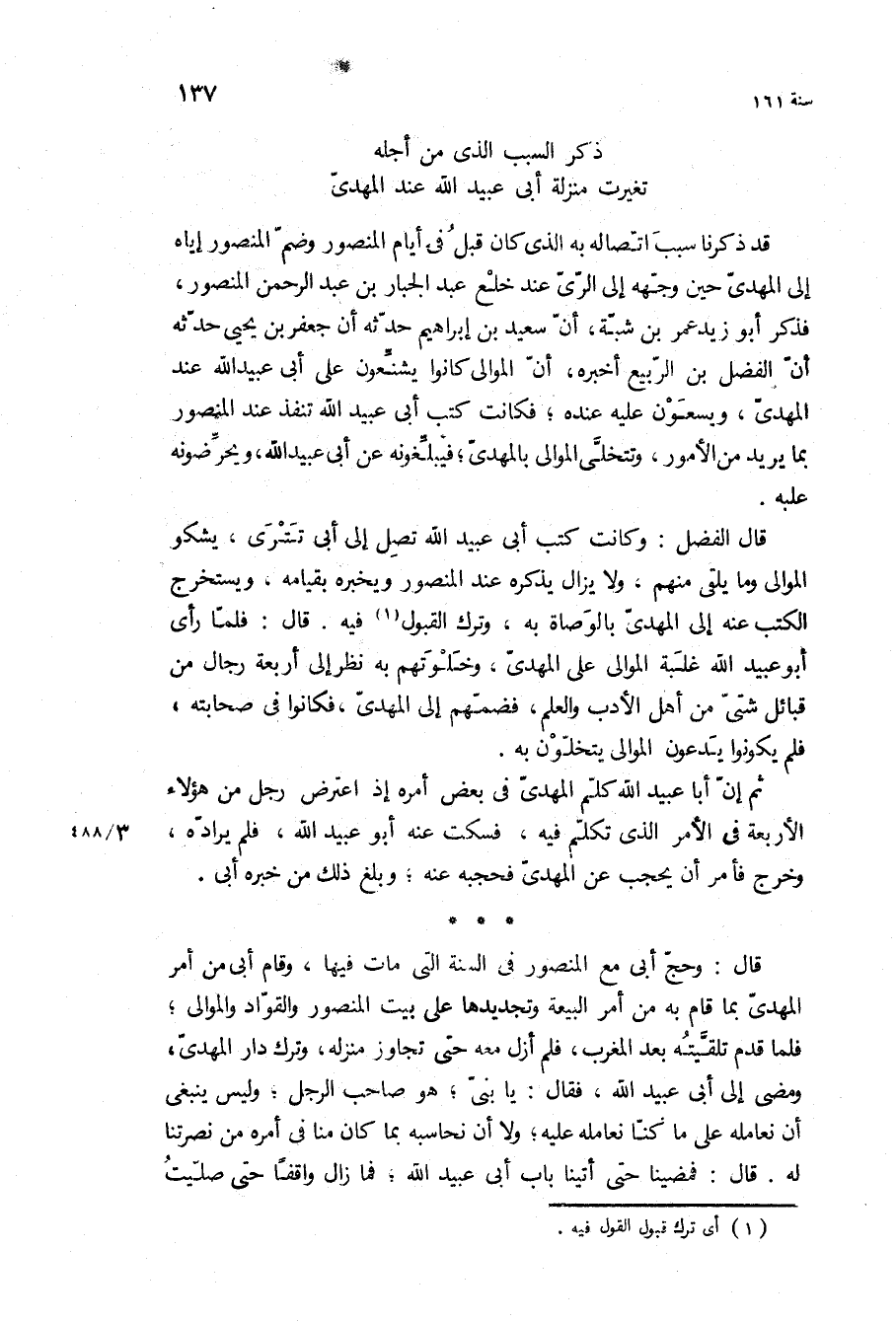 قَالَ: وحج أبي مع المنصور في السنة التي مات فيها، وقام أبي من أمر المهدي بما قام به من أمر البيعة وتجديدها على بيت المنصور والقواد والموالي، فلما قدم تلقيته بعد المغرب، فلم أزل معه حتى تجاوز منزله، وترك دار المهدي، ومضى إلى أبي عبيد الله، فقال: يا بني، هو صاحب الرجل، وليس ينبغي أن نعامله على ما كنا نعامله عليه، ولا أن نحاسبه بما كان منا في أمره من نصرتنا له قَالَ: فمضينا حتى أتينا باب أبي عبيد الله، فما زال واقفا حتى صليت