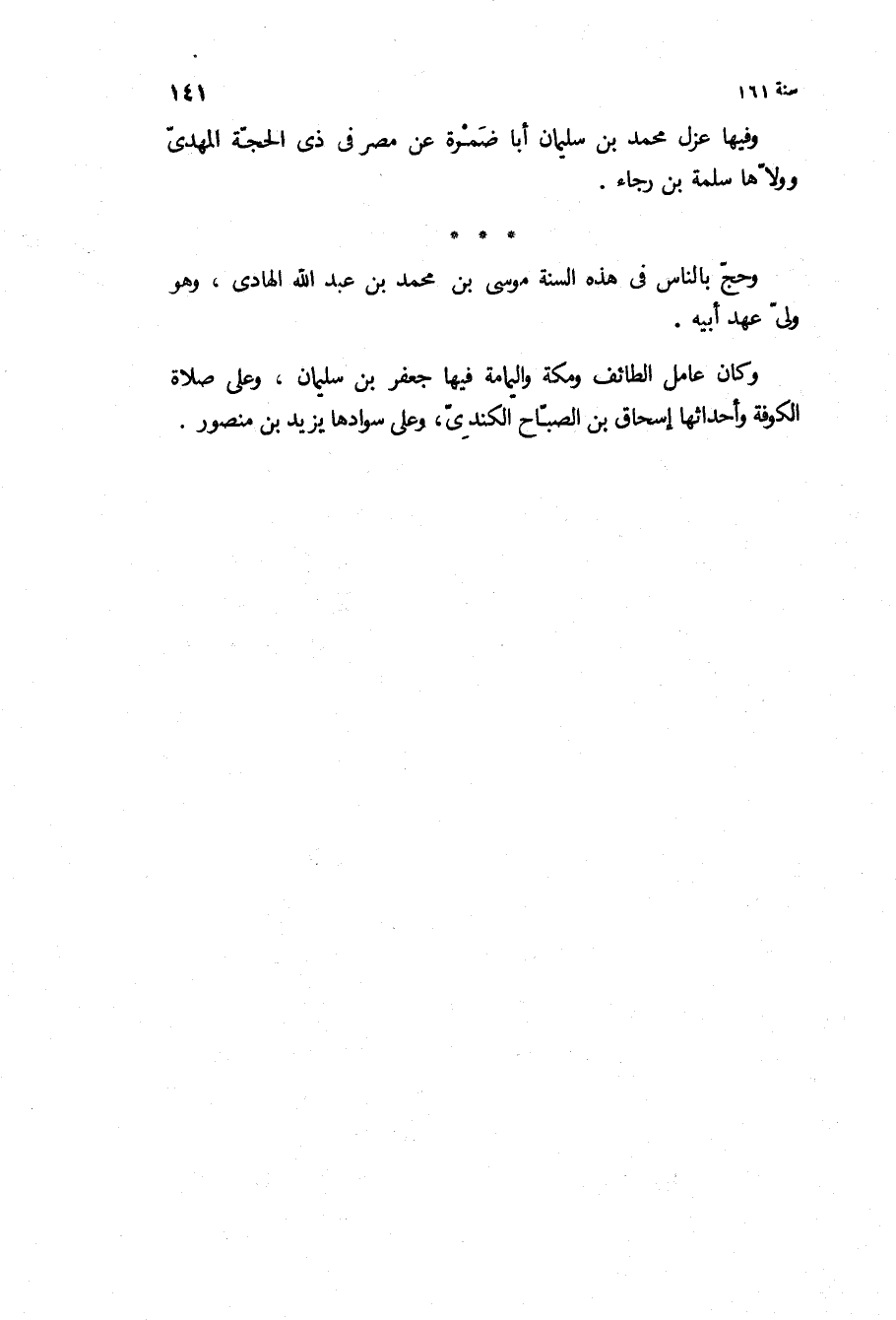 وفيها عزل محمد بْن سليمان أبا ضمرة عن مصر في ذي الحجة المهدي وولاها سلمة بْن رجاء.