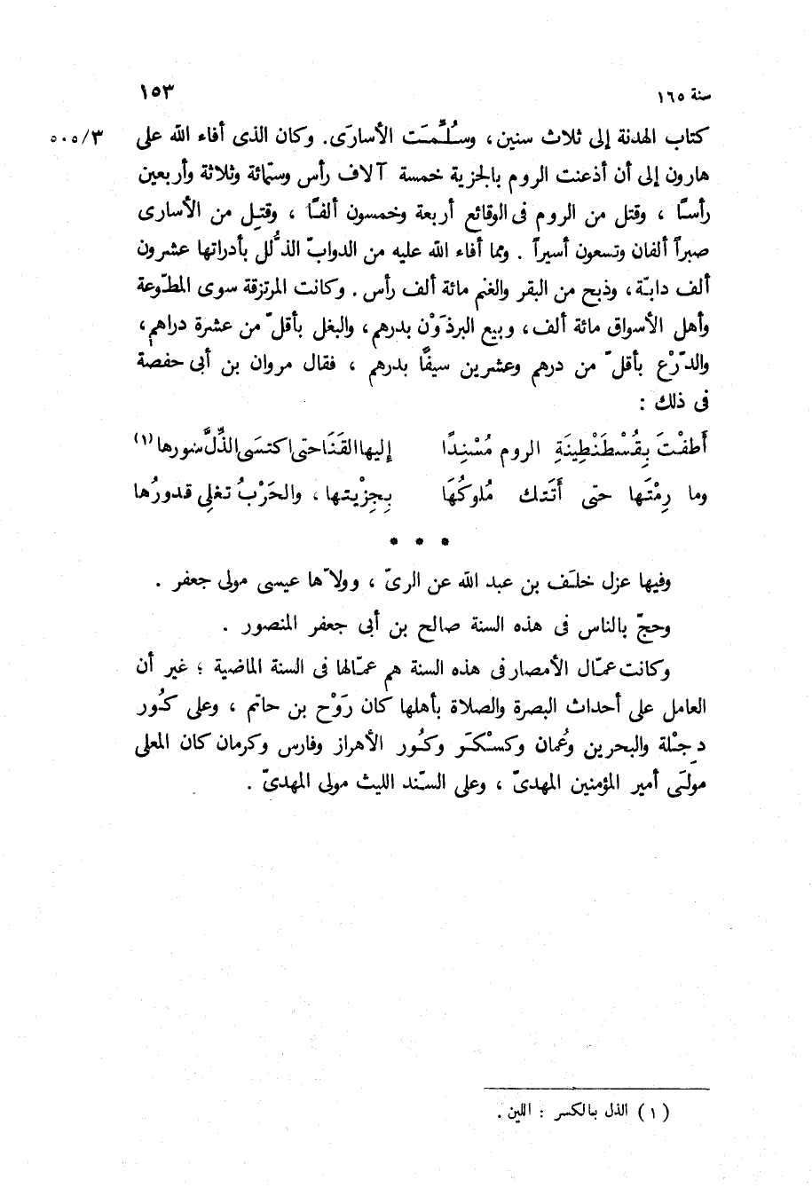 كتاب الهدنة إلى ثلاث سنين، وسلمت الأسارى وكان الذي أفاء الله على هارون إلى أن أذعنت الروم بالجزية خمسة آلاف رأس وستمائه وثلاثة وأربعين رأسا، وقتل من الروم في الوقائع أربعة وخمسون ألفا، وقتل من الأسارى صبرا ألفان وتسعون أسيرا ومما أفاء الله عليه من الدواب الذلل بأدواتها عشرون ألف دابة، وذبح من البقر والغنم مائة ألف رأس وكانت المرتزقة سوى المطوعة وأهل الأسواق مائة ألف، وبيع البرذون بدرهم، والبغل بأقل من عشرة دراهم، والدرع بأقل من درهم وعشرين سيفا بدرهم، فقال مروان بْن أبي حفصة في ذلك:
