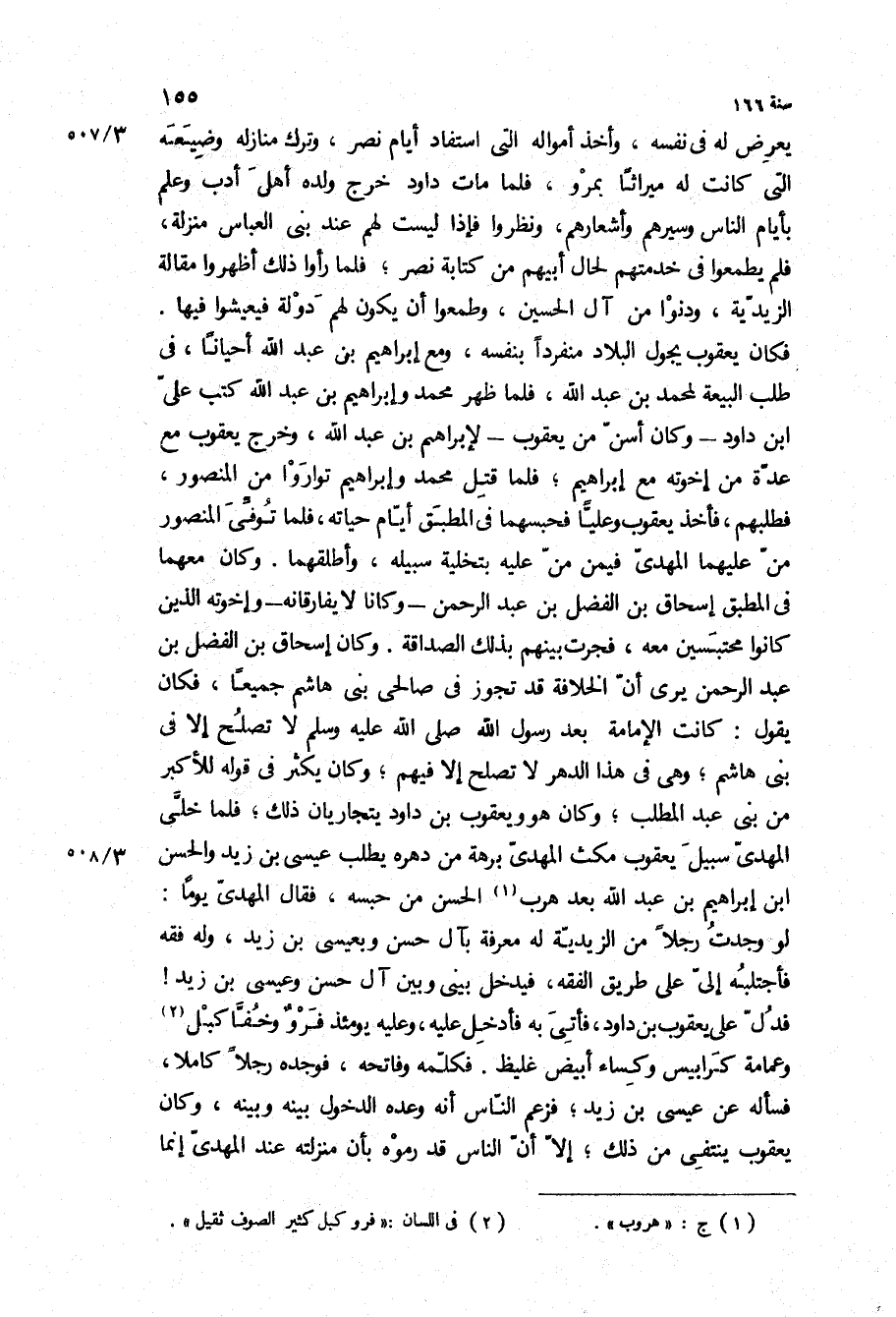 يعرض له في نفسه، وأخذ أمواله التي استفاد أيام نصر، وترك منازله وضيعه التي كانت له ميراثا بمرو، فلما مات داود خرج ولده أهل أدب وعلم بأيام الناس وسيرهم وأشعارهم، ونظروا فإذا ليست لهم عند بني العباس منزلة، فلم يطمعوا في خدمتهم لحال أبيهم من كتابة نصر، فلما رأوا ذلك أظهروا مقالة الزيدية، ودنوا من آل الحسين، وطمعوا أن يكون لهم دولة فيعيشوا فيها.