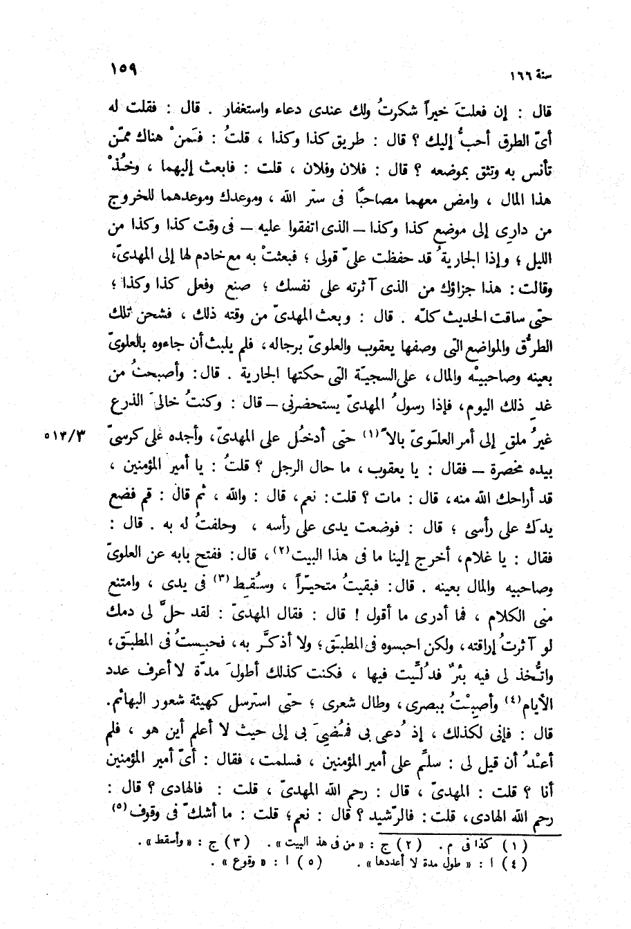 قَالَ: إن فعلت خيرا شكرت ولك عندي دعاء واستغفار قَالَ: فقلت له أي الطرق أحب إليك؟ قَالَ: طريق كذا وكذا، قلت: فمن هناك ممن تأنس به وتثق بموضعه؟ قَالَ: فلان وفلان، قلت: فابعث إليهما، وخذ هذا المال، وامض معهما مصاحبا في ستر الله، وموعدك وموعدهما للخروج من داري إلى موضع كذا وكذا- الذي اتفقوا عليه- في وقت كذا وكذا من الليل، وإذا الجارية قد حفظت علي قولي، فبعثت به مع خادم لها إلى المهدي، وقالت: هذا جزاؤك من الذي آثرته على نفسك، صنع وفعل كذا وكذا، حتى ساقت الحديث كله قَالَ: وبعث المهدي من وقته ذلك، فشحن تلك الطرق والمواضع التي وصفها يعقوب والعلوي برجاله، فلم يلبث ان جاءوه بالعلوي بعينه وصاحبيه والمال، على السجية التي حكتها الجارية قَالَ: وأصبحت من غد ذلك اليوم، فإذا رسول المهدي يستحضرني- قَالَ: وكنت خالي الذرع غير ملق الى امر العلوي بالا حتى أدخل على المهدي، وأجده على كرسي بيده مخصرة- فقال: يا يعقوب، ما حال الرجل؟ قلت: يا أمير المؤمنين، قد أراحك الله منه، قَالَ: مات؟ قلت: نعم، قَالَ: والله، ثم قَالَ: قم فضع يدك على رأسي، قَالَ: فوضعت يدي على رأسه، وحلفت له به قَالَ: