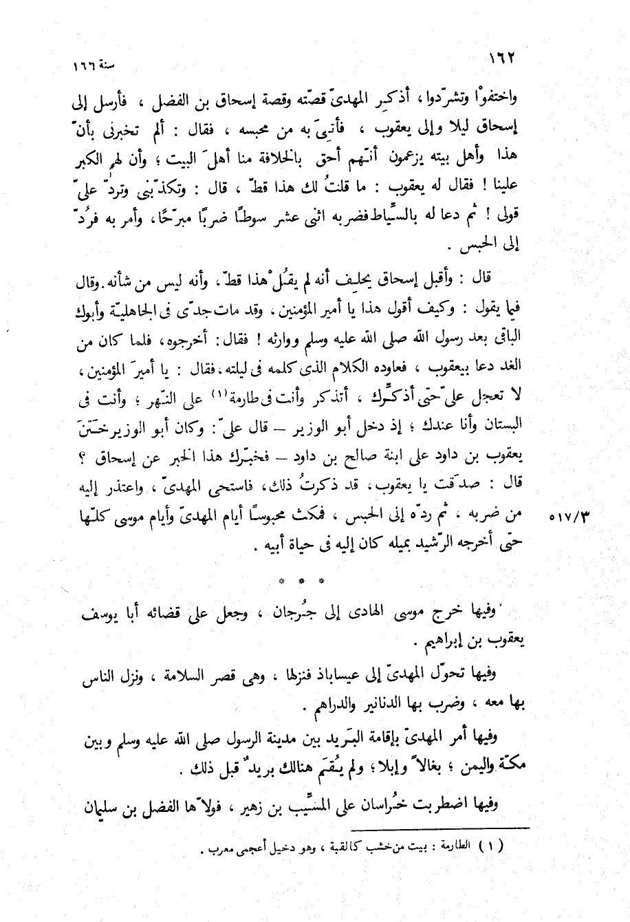 واختفوا وتشردوا، أذكر المهدي قصته وقصة إسحاق بْن الفضل، فأرسل إلى إسحاق ليلا وإلى يعقوب، فأتي به من محبسه، فقال: ألم تخبرني بأن هذا وأهل بيته يزعمون أنهم أحق بالخلافة منا أهل البيت، وأن لهم الكبر علينا! فقال له يعقوب: ما قلت لك هذا قط، قَالَ: وتكذبني وترد علي قولي! ثم دعا له بالسياط فضربه اثني عشر سوطا ضربا مبرحا، وأمر به فرد إلى الحبس.