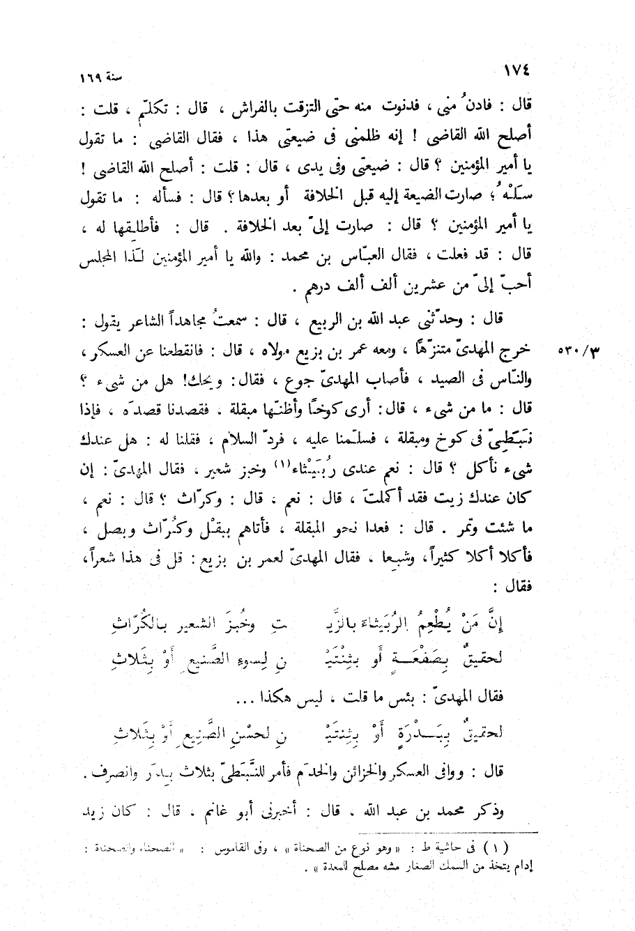 قَالَ: ما من شيء، قَالَ: أرى كوخًا وأظنها مبقلة، فقصدنا قصده، فإذا نبطي في كوخ ومبقلة، فسلمنا عليه، فرد السلام، فقلنا له: هل عندك شيء نأكل؟ قَالَ: نعم عندي ربيثاء وخبز شعير، فقال المهدي: إن كان عندك زيت فقد أكملت، قَالَ: نعم، قال: وكراث؟ قَالَ: نعم، ما شئت وتمر قَالَ: فعدا نحو المبقلة، فأتاهم ببقل وكراث وبصل، فأكلا أكلا كثيرا، وشبعا، فقال المهدي لعمر بْن بزيع: قل في هذا شعرا، فقال: