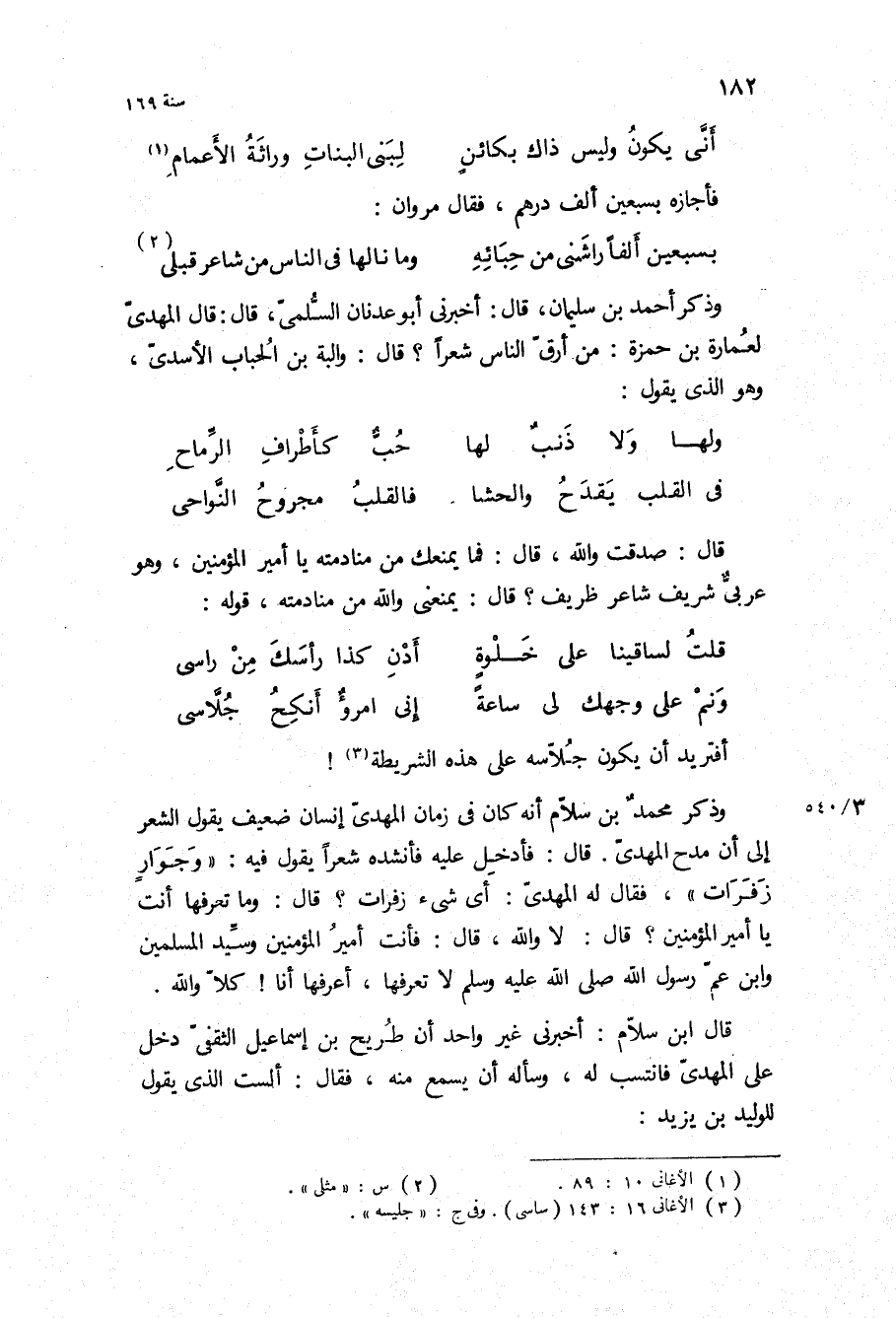 افتريد ان يكون جلاسه على هذه الشريطة! وذكر محمد بْن سلام أنه كان في زمان المهدي إنسان ضعيف يقول الشعر إلى أن مدح المهدي قَالَ: فأدخل عليه فأنشده شعرا يقول فيه: وجوار زفرات، فقال له المهدي: أي شيء زفرات؟ قَالَ وما تعرفها أنت يا أمير المؤمنين؟ قَالَ: لا والله، قَالَ: فأنت أمير المؤمنين وسيد المسلمين وابن عم رسول الله ص لا تعرفها، أعرفها أنا! كلا والله.