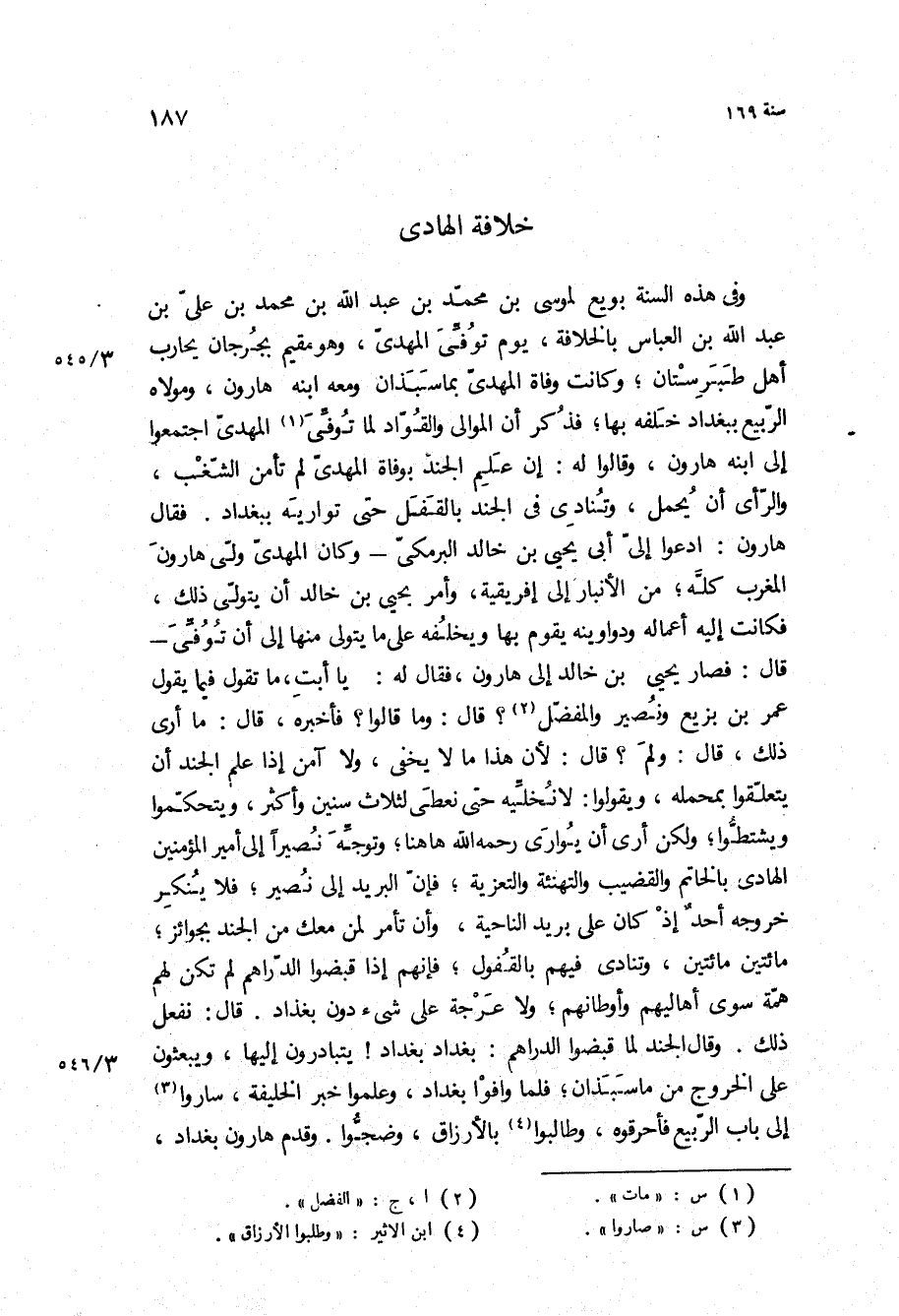 وفي هذه السنة بويع لموسى بن محمد بن عبد الله بن محمد بن علي بن عبد الله بن العباس بالخلافة، يوم توفي المهدي، وهو مقيم بجرجان يحارب أهل طبرستان، وكانت وفاة المهدي بماسبذان ومعه ابنه هارون، ومولاه الربيع ببغداد خلفه بها، فذكر أن الموالي والقواد لما توفي المهدي اجتمعوا إلى ابنه هارون، وقالوا له: إن علم الجند بوفاة المهدي لم تأمن الشغب، والرأي أن يحمل، وتنادي في الجند بالقفل حتى تواريه ببغداد فقال هارون: ادعوا إلي أبي يحيى بْن خالد البرمكي- وكان المهدي ولى هارون المغرب كله، من الأنبار إلى إفريقية، وأمر يحيى بْن خالد أن يتولى ذلك، فكانت إليه أعماله ودواوينه يقوم بها ويخلفه على ما يتولى منها الى ان توفى- قال: فصار يحيى بْن خالد إلى هارون، فقال له: يا أبت، ما تقول فيما يقول عمر بْن بزيع ونصير والمفضل؟ قال: وما قالوا؟ فأخبره، قَالَ: ما أرى ذلك، قَالَ: ولم؟ قَالَ: لأن هذا ما لا يخفى، ولا آمن إذا علم الجند أن يتعلقوا بمحمله، ويقولوا: لا نخليه حتى نعطى لثلاث سنين وأكثر، ويتحكموا ويشتطوا، ولكن أرى أن يوارى رحمه الله هاهنا، وتوجه نصيرا إلى أمير المؤمنين الهادي بالخاتم والقضيب والتهنئة والتعزية، فإن البريد إلى نصير، فلا ينكر خروجه أحد إذ كان على بريد الناحية، وأن تأمر لمن معك من الجند بجوائز، مائتين مائتين، وتنادي فيهم بالقفول، فإنهم إذا قبضوا الدراهم لم تكن لهم همة سوى أهاليهم وأوطانهم، ولا عرجة على شيء دون بغداد قال: نفعل ذلك وقال الجند لما قبضوا الدراهم: بغداد بغداد! يتبادرون إليها، ويبعثون على الخروج من ماسبذان، فلما وافوا بغداد، وعلموا خبر الخليفة، ساروا إلى باب الربيع فأحرقوه، وطالبوا بالأرزاق، وضجوا وقدم هارون بغداد،