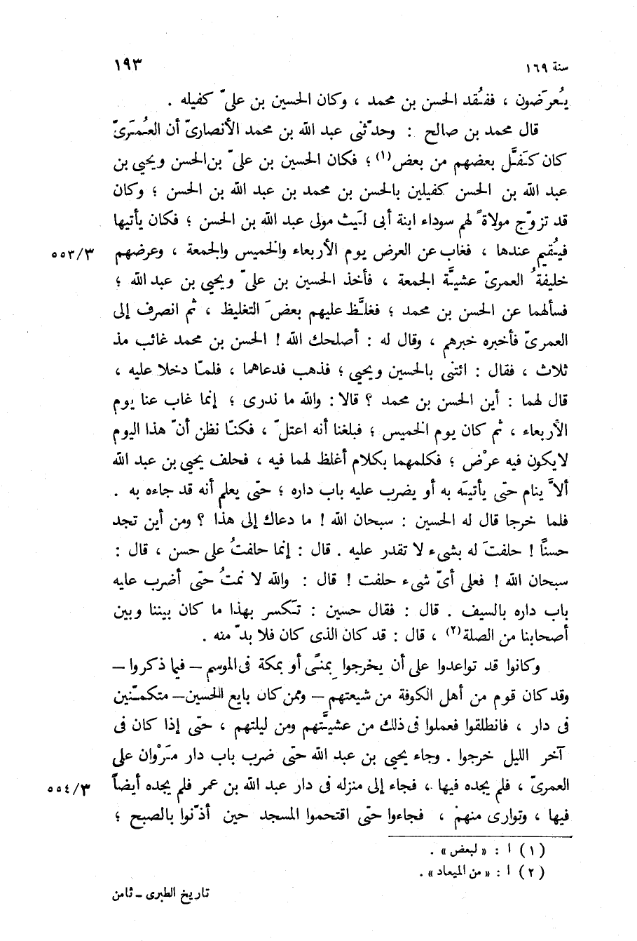 يعرضون، ففقد الحسن بْن محمد، وكان الحسين بْن علي كفيله قَالَ محمد بْن صالح: وحدثني عبد الله بْن محمد الأنصاري أن العمري كان كفل بعضهم من بعض، فكان الحسين بْن علي بْن الحسن ويحيى بْن عبد الله بْن الحسن كفيلين بالحسن بْن محمد بْن عبد الله بْن الحسن، وكان قد تزوج مولاة لهم سوداء ابنة أبي ليث مولى عبد الله بْن الحسن، فكان يأتيها فيقيم عندها، فغاب عن العرض يوم الأربعاء والخميس والجمعة، وعرضهم خليفة العمري عشية الجمعة، فأخذ الحسين بْن علي ويحيى بْن عبد الله، فسألهما عن الحسن بْن محمد، فغلظ عليهم بعض التغليظ، ثم انصرف إلى العمري فأخبره خبرهم، وقال له: أصلحك الله! الحسن بْن محمد غائب مذ ثلاث، فقال: ائتني بالحسين ويحيى، فذهب فدعاهما، فلما دخلا عليه، قَالَ لهما: أين الحسن بْن محمد؟ قالا: والله ما ندري، إنما غاب عنا يوم الأربعاء، ثم كان يوم الخميس، فبلغنا أنه اعتل، فكنا نظن أن هذا اليوم لا يكون فيه عرض، فكلمهما بكلام أغلظ لهما فيه، فحلف يحيى بْن عبد الله ألا ينام حتى يأتيه به أو يضرب عليه باب داره، حتى يعلم أنه قد جاءه به.