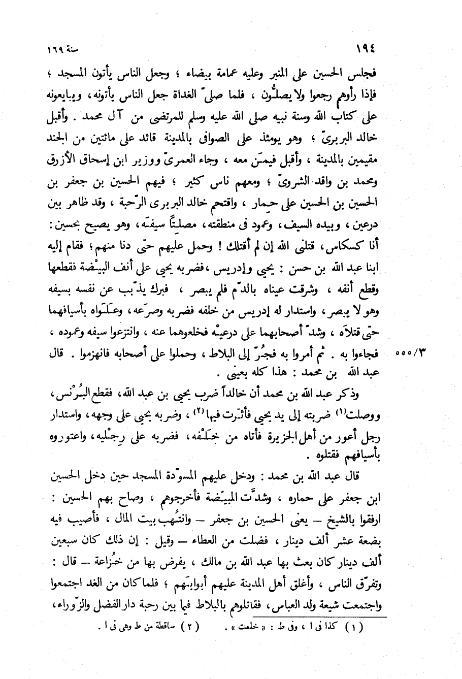 فجلس الحسين على المنبر وعليه عمامة بيضاء، وجعل الناس يأتون المسجد، فإذا رأوهم رجعوا ولا يصلون، فلما صلى الغداة جعل الناس يأتونه، ويبايعونه على كتاب الله وسنة نبيه ص للمرتضى من آل محمد وأقبل خالد البربري، وهو يومئذ على الصوافي بالمدينة قائد على مائتين من الجند مقيمين بالمدينة، وأقبل فيمن معه، وجاء العمري ووزير ابن إسحاق الأزرق ومحمد بْن واقد الشروي، ومعهم ناس كثير، فيهم الحسين بْن جعفر بْن الحسين بْن الحسين على حمار، واقتحم خالد البربري الرحبة، وقد ظاهر بين درعين، وبيده السيف، وعمود في منطقته، مصلتا سيفه، وهو يصيح بحسين:
