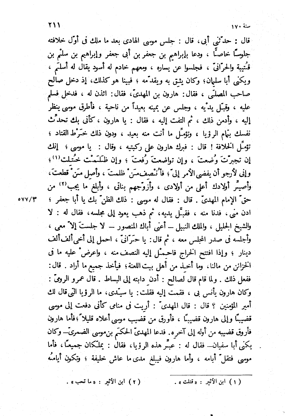 قَالَ: حدثني أبي، قَالَ: جلس موسى الهادي بعد ما ملك في أول خلافته جلوسا خاصا، ودعا بإبراهيم بْن جعفر بْن أبي جعفر وإبراهيم بْن سلم بْن قتيبة والحراني، فجلسوا عن يساره، ومعهم خادم له أسود يقال له أسلم، ويكنى أبا سليمان، وكان يثق به ويقدمه، فبينا هو كذلك، إذ دخل صالح صاحب المصلى، فقال: هارون بْن المهدي، فقال: ائذن له، فدخل فسلم عليه، وقبل يديه، وجلس عن يمينه بعيدا من ناحية، فأطرق موسى ينظر إليه، وأدمن ذلك، ثم التفت إليه، فقال: يا هارون، كأني بك تحدث نفسك بتمام الرؤيا، وتؤمل ما أنت منه بعيد، ودون ذلك خرط القتاد، تؤمل الخلافة! قَالَ: فبرك هارون على ركبتيه، وقال: يا موسى، إنك إن تجبرت وضعت، وإن تواضعت رفعت، وإن ظلمت ختلت، وإني لأرجو أن يفضي الأمر إلي، فأنصف من ظلمت، وأصل من قطعت، وأصير أولادك أعلى من أولادي، وأزوجهم بناتي، وأبلغ ما يجب من حق الإمام المهدي قَالَ: فقال له موسى: ذلك الظن بك يا أبا جعفر، ادن مني، فدنا منه، فقبل يديه، ثم ذهب يعود إلى مجلسه، فقال له: لا والشيخ الجليل، والملك النبيل- أعني أباك المنصور- لا جلست إلا معي، وأجلسه في صدر المجلس معه، ثم قَالَ: يا حراني، احمل الى أخي الف ألف دينار، وإذا افتتح الخراج فاحمل إليه النصف منه، واعرض عليه ما في الخزائن من مالنا، وما أخذ من أهل بيت اللعنة، فيأخذ جميع ما أراد قَالَ: