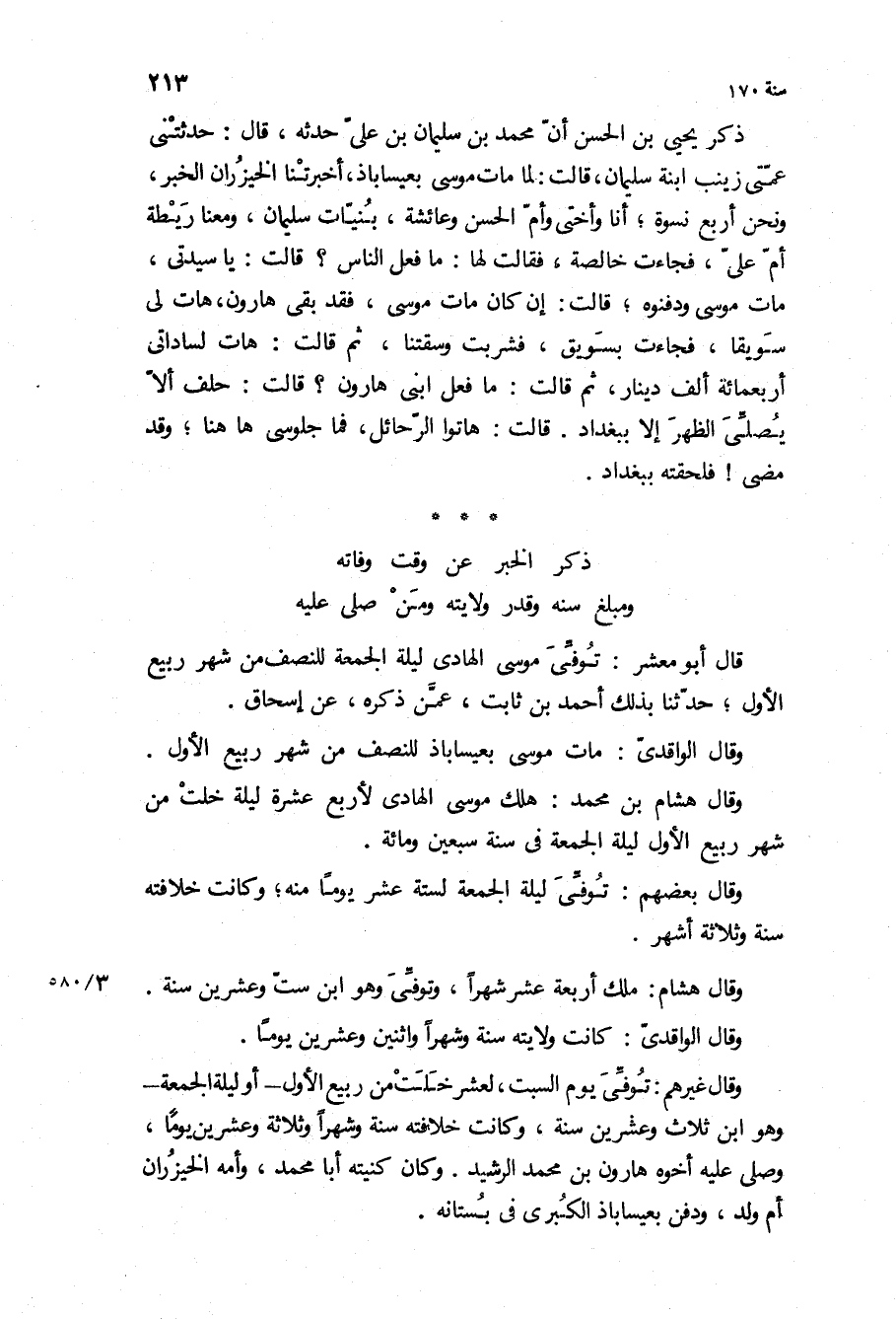 وقال هشام بْن محمد: هلك موسى الهادي لأربع عَشْرَةَ لَيْلَةً خَلَتْ مِنْ شَهْرِ رَبِيعٍ الأَوَّلِ ليلة الجمعة في سنة سبعين ومائة.