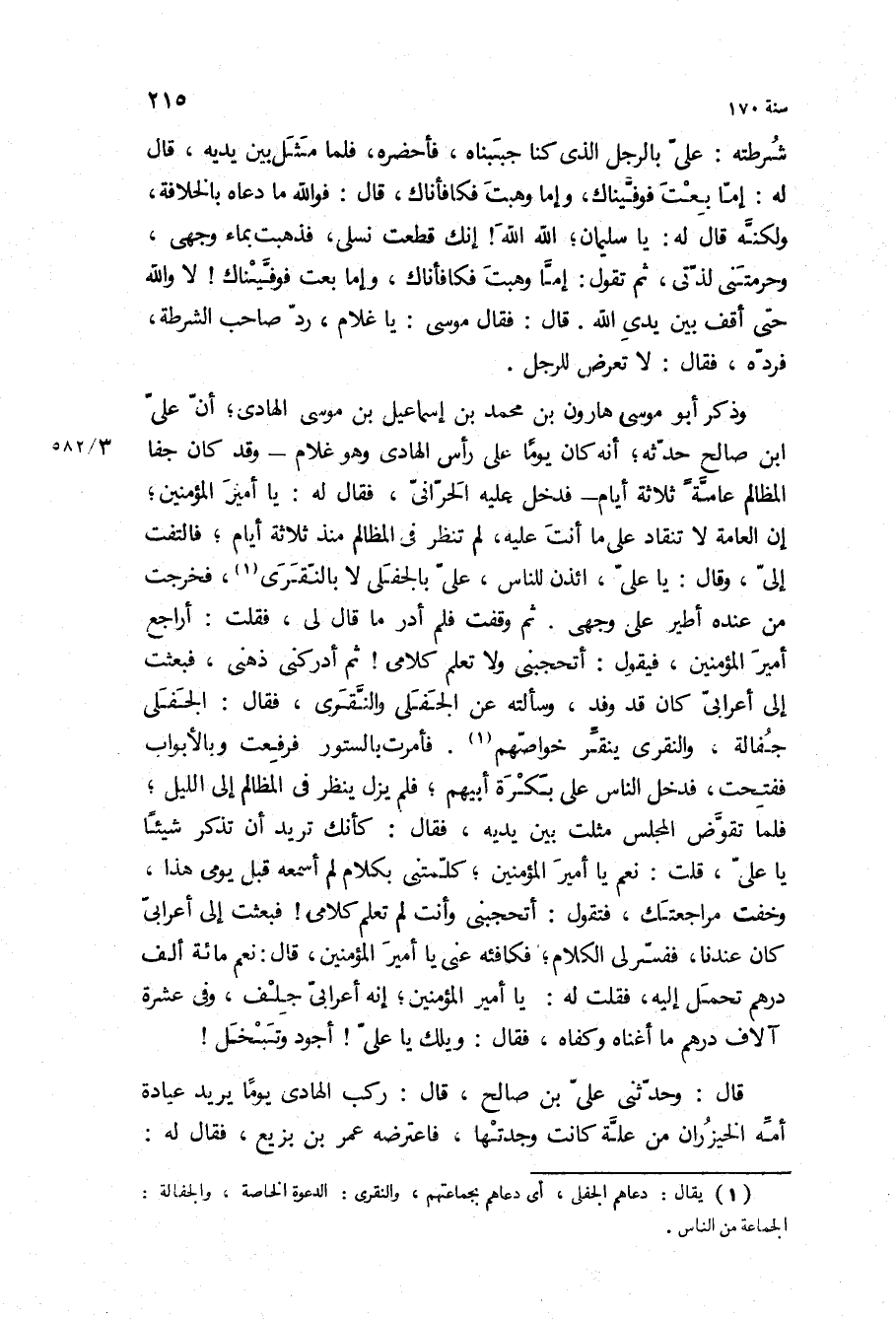 شرطته: علي بالرجل الذي كنا جببناه، فأحضره، فلما مثل بين يديه، قَالَ له: إما بعت فوفيناك، واما وهبت فكافأناك، قال: فو الله ما دعاه بالخلافة، ولكنه قَالَ له: يا سليمان، الله الله! إنك قطعت نسلي، فذهبت بماء وجهي، وحرمتني لذتي، ثم تقول: إما وهبت فكافأناك، وإما بعت فوفيناك! لا والله حتى أقف بين يدي الله قَالَ: فقال موسى: يا غلام، رد صاحب الشرطة، فرده، فقال: لا تعرض للرجل وذكر أبو موسى هارون بْن محمد بْن إسماعيل بْن موسى الهادي، ان على ابن صالح حدثه، أنه كان يوما على رأس الهادي وهو غلام- وقد كان جفا المظالم عامة ثلاثة أيام- فدخل عليه الحراني، فقال له: يا أمير المؤمنين، إن العامة لا تنقاد على ما أنت عليه، لم تنظر في المظالم منذ ثلاثة أيام، فالتفت إلي، وقال: يا علي، ائذن للناس، علي بالجفلى لا بالنقرى، فخرجت من عنده أطير على وجهي ثم وقفت فلم أدر ما قَالَ لي، فقلت: أراجع أمير المؤمنين، فيقول: أتحجبني ولا تعلم كلامي! ثم أدركني ذهني، فبعثت الى اعرابى كان قد وفد، وسألته عن الجفلى والنقرى، فقال: الجفلى جفالة، والنقرى ينقر خواصهم فأمرت بالستور فرفعت وبالأبواب ففتحت، فدخل الناس على بكرة أبيهم، فلم يزل ينظر في المظالم إلى الليل، فلما تقوض المجلس مثلت بين يديه، فقال: كأنك تريد أن تذكر شيئا يا علي، قلت: نعم يا أمير المؤمنين، كلمتني بكلام لم أسمعه قبل يومي هذا، وخفت مراجعتك، فتقول: أتحجبني وأنت لم تعلم كلامي! فبعثت إلى أعرابي كان عندنا، ففسر لي الكلام، فكافئه عني يا أمير المؤمنين، قَالَ: نعم مائة ألف درهم تحمل اليه، فقلت له: يا أمير المؤمنين، إنه أعرابي جلف، وفي عشرة آلاف درهم ما أغناه وكفاه، فقال: ويلك يا علي! أجود وتبخل! قَالَ: وحدثني علي بْن صالح، قَالَ: ركب الهاديّ يوما يريد عيادة أمه الخيزران من علة كانت وجدتها، فاعترضه عمر بْن بزيع، فقال له: