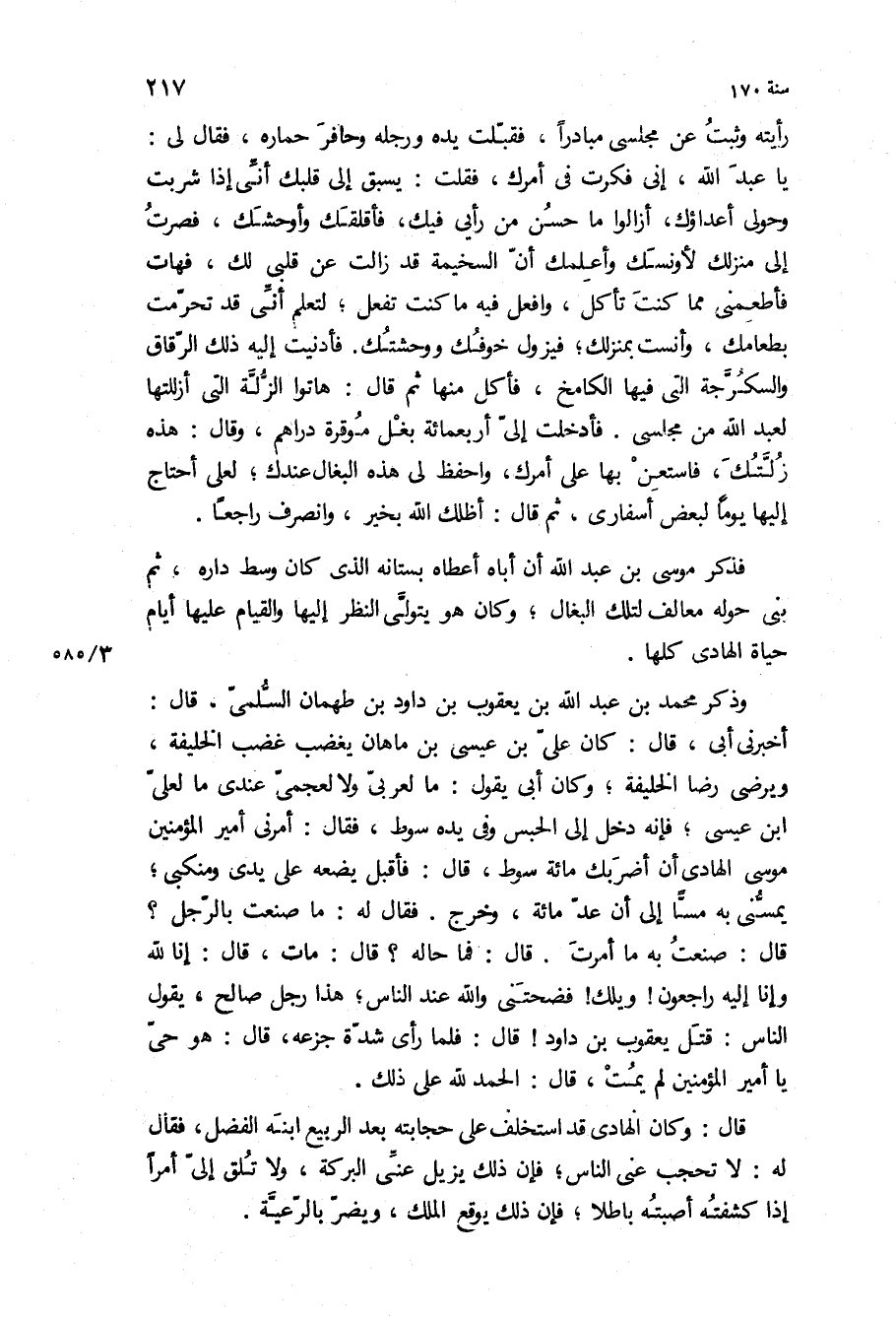قَالَ: وكان الهادي قد استخلف على حجابته بعد الربيع ابنه الفضل، فقال له: لا تحجب عني الناس، فإن ذلك يزيل عني البركة، ولا تلق إلي أمرا إذا كشفته أصبته باطلا، فإن ذلك يوقع الملك، ويضر بالرعية