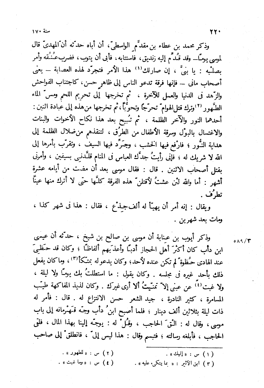 وذكر محمد بْن عطاء بْن مقدم الواسطي، أن أباه حدثه أن المهدي قَالَ لموسى يوما- وقد قدم إليه زنديق، فاستتابه، فأبى أن يتوب، فضرب عنقه وأمر بصلبه: يا بني، إن صار لك هذا الأمر فتجرد لهذه العصابة- يعني أصحاب ماني- فإنها فرقة تدعو الناس إلى ظاهر حسن، كاجتناب الفواحش والزهد في الدنيا والعمل للآخرة، ثم تخرجها إلى تحريم اللحم ومس الماء الطهور وترك قتل الهوام تحرجا وتحوبا، ثم تخرجها من هذه إلى عبادة اثنين: