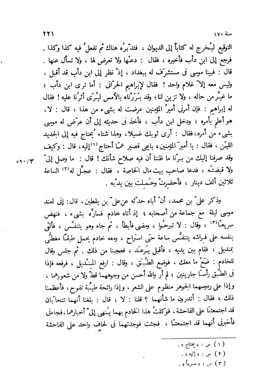 وذكر علي بْن محمد، أن أباه حدثه عن علي بْن يقطين، قَالَ: إني لعند موسى ليلة مع جماعة من أصحابه، إذ أتاه خادم فساره بشيء، فنهض سريعا، وقال: لا تبرحوا، ومضى فأبطأ، ثم جاء وهو يتنفس، فألقى بنفسه على فراشه يتنفس ساعة حتى استراح، ومعه خادم يحمل طبقا مغطى بمنديل، فقام بين يديه، فأقبل يرعد، فعجبنا من ذلك ثم جلس وقال للخادم: ضع ما معك، فوضع الطبق، وقال: ارفع المنديل، فرفعه فإذا في الطبق رأسا جاريتين، لم أر والله أحسن من وجوههما قط ولا من شعورهما، وإذا على رءوسهما الجوهر منظوم على الشعر، وإذا رائحة طيبة تفوح، فأعظمنا ذلك، فقال: أتدرون ما شأنهما؟ قلنا: لا، قَالَ: بلغنا أنهما تتحابان قد اجتمعتا على الفاحشة، فوكلت هذا الخادم بهما ينهي إلي أخبارهما، فجاءني فأخبرني أنهما قد اجتمعتا، فجئت فوجدتهما في لحاف واحد على الفاحشة