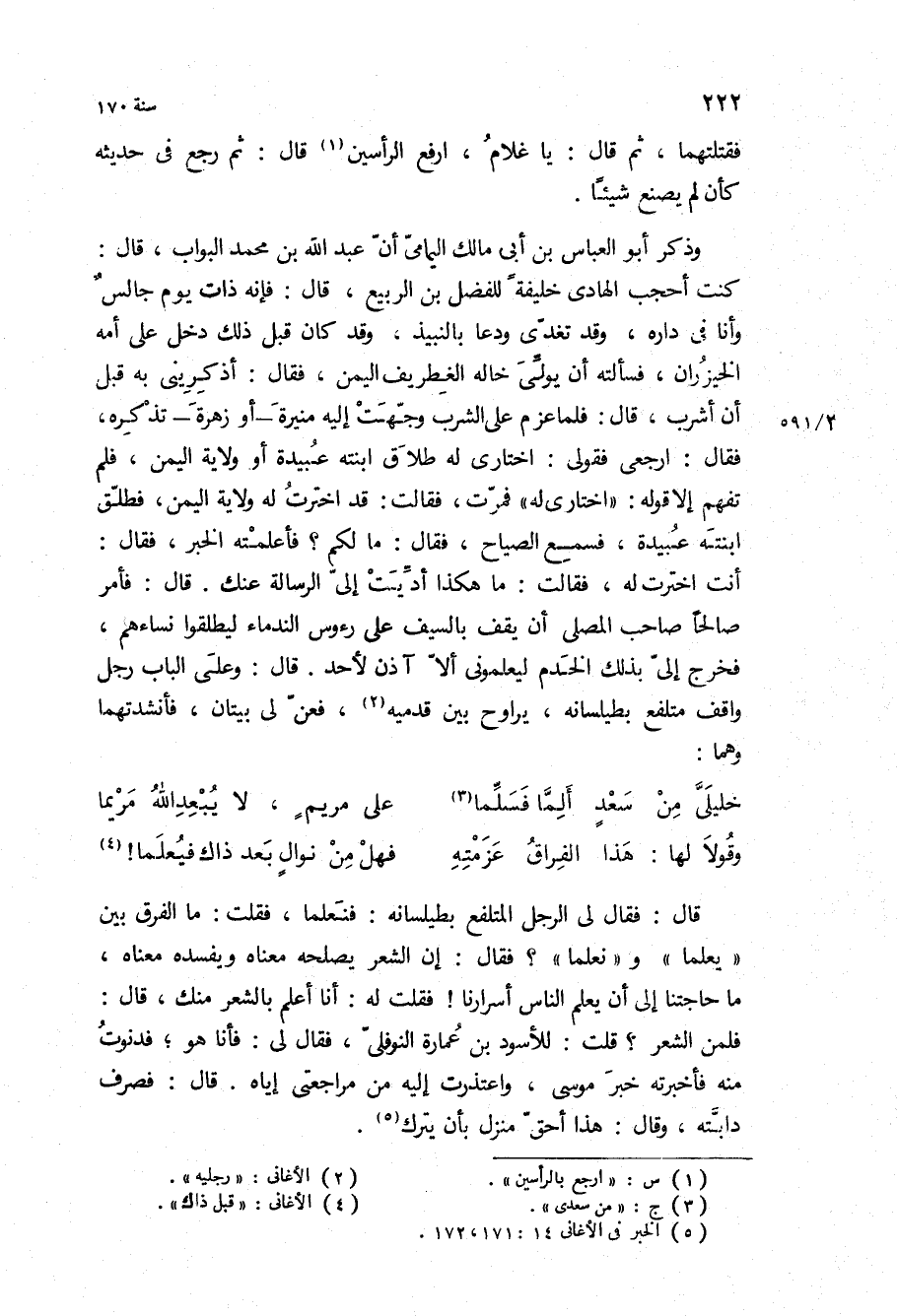 أنت اخترت له، فقالت: ما هكذا أديت إلي الرسالة عنك قَالَ: فأمر صالحا صاحب المصلى أن يقف بالسيف على رءوس الندماء ليطلقوا نساءهم، فخرج إلي بذلك الخدم ليعلموني ألا آذن لأحد قَالَ: وعلى الباب رجل واقف متلفع بطيلسانه، يراوح بين قدميه، فعن لي بيتان، فأنشدتهما وهما: