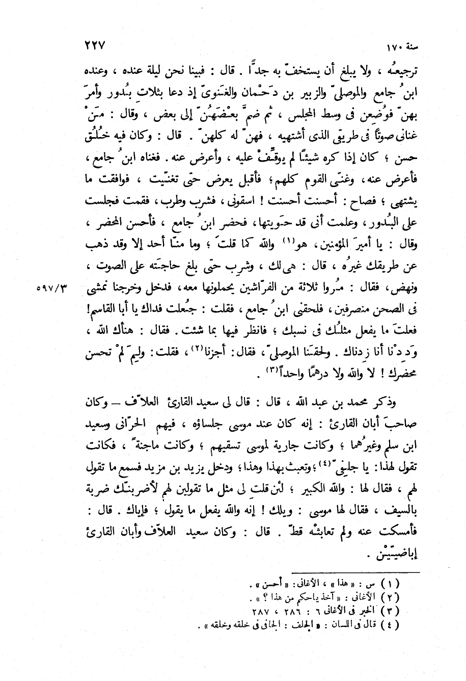 ترجيعه، ولا يبلغ أن يستخف به جدا قَالَ: فبينا نحن ليلة عنده، وعنده ابن جامع والموصلي والزبير بْن دحمان والغنوي إذ دعا بثلاث بدور وأمر بهن فوضعن في وسط المجلس، ثم ضم بعضهن إلى بعض، وقال: من غناني صوتا في طريقي الذي أشتهيه، فهن له كلهن قَالَ: وكان فيه خلق حسن، كان إذا كره شيئا لم يوقف عليه، وأعرض عنه فغناه ابن جامع، فأعرض عنه، وغنى القوم كلهم، فأقبل يعرض حتى تغنيت، فوافقت ما يشتهي، فصاح: أحسنت أحسنت! اسقوني، فشرب وطرب، فقمت فجلست على البدور، وعلمت أني قد حويتها، فحضر ابن جامع، فأحسن المحضر، وقال: يا أمير المؤمنين، هو والله كما قلت، وما منا أحد إلا وقد ذهب عن طريقك غيره، قال: هي لك، وشرب حتى بلغ حاجته على الصوت، ونهض، فقال: مروا ثلاثة من الفراشين يحملونها معه، فدخل وخرجنا نمشي في الصحن منصرفين، فلحقني ابن جامع، فقلت: جعلت فداك يا أبا القاسم! فعلت ما يفعل مثلك في نسبك، فانظر فيها بما شئت فقال: هنأك الله، وددنا أنا زدناك ولحقنا الموصلي، فقال: أجزنا، فقلت: ولم لم تحسن محضرك! لا والله ولا درهما واحدا.