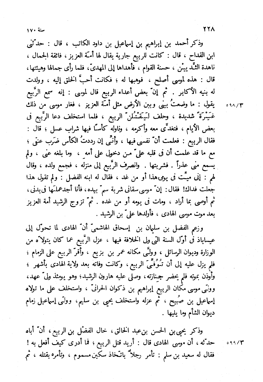 وذكر يحيى بْن الحسن بْن عبد الخالق، خال الفضل بْن الربيع، أن أباه حدثه، أن موسى الهادي قَالَ: أريد قتل الربيع، فما أدري كيف أفعل به! فقال له سعيد بْن سلم: تأمر رجلا باتخاذ سكين مسموم، وتأمره بقتله، ثم