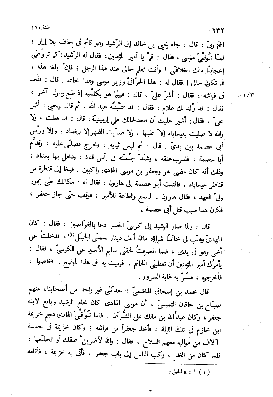قَالَ محمد بْن إسحاق الهاشمي: حدثني غير واحد من أصحابنا، منهم صباح بْن خاقان التميمي، أن موسى الهادي كان خلع الرشيد وبايع لابنه جعفر، وكان عبد الله بْن مالك على الشرط، فلما توفي الهادي هجم خزيمة ابن خازم في تلك الليلة، فأخذ جعفرا من فراشه، وكان خزيمة في خمسة آلاف من مواليه معهم السلاح، فقال: والله لأضربن عنقك أو تخلعها، فلما كان من الغد، ركب الناس إلى باب جعفر، فأتى به خزيمة، فأقامه