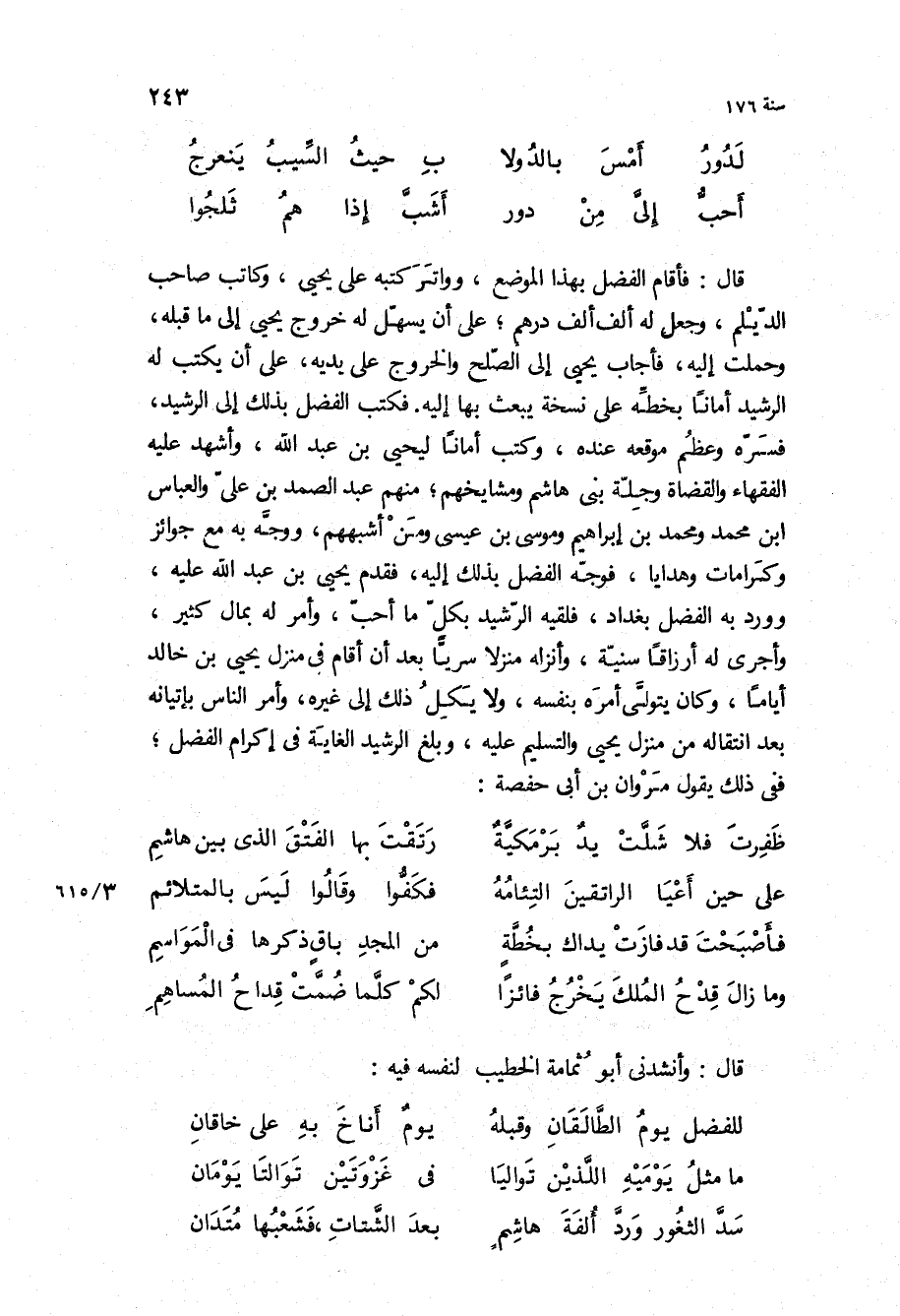 قال: فأقام الفضل بهذا الموضع، وواتر كتبه على يحيى، وكاتب صاحب الديلم، وجعل له ألف ألف درهم، على أن يسهل له خروج يحيى إلى ما قبله، وحملت إليه، فأجاب يحيى إلى الصلح والخروج على يديه، على أن يكتب له الرشيد أمانا بخطه على نسخة يبعث بها إليه فكتب الفضل بذلك إلى الرشيد، فسره وعظم موقعه عنده، وكتب أمانا ليحيى بْن عبد الله، وأشهد عليه الفقهاء والقضاة وجلة بني هاشم ومشايخهم، منهم عبد الصمد بْن علي والعباس ابن محمد ومحمد بْن إبراهيم وموسى بْن عيسى ومن أشبههم، ووجه به مع جوائز وكرامات وهدايا، فوجه الفضل بذلك إليه، فقدم يحيى بْن عبد الله عليه، وورد به الفضل بغداد، فلقيه الرشيد بكل ما أحب، وأمر له بمال كثير، وأجرى له أرزاقا سنية، وأنزله منزلا سريا بعد أن أقام في منزل يحيى بْن خالد أياما، وكان يتولى أمره بنفسه، ولا يكل ذلك إلى غيره، وأمر الناس بإتيانه بعد انتقاله من منزل يحيى والتسليم عليه، وبلغ الرشيد الغاية في إكرام الفضل، ففي ذلك يقول مروان بْن أبي حفصة: