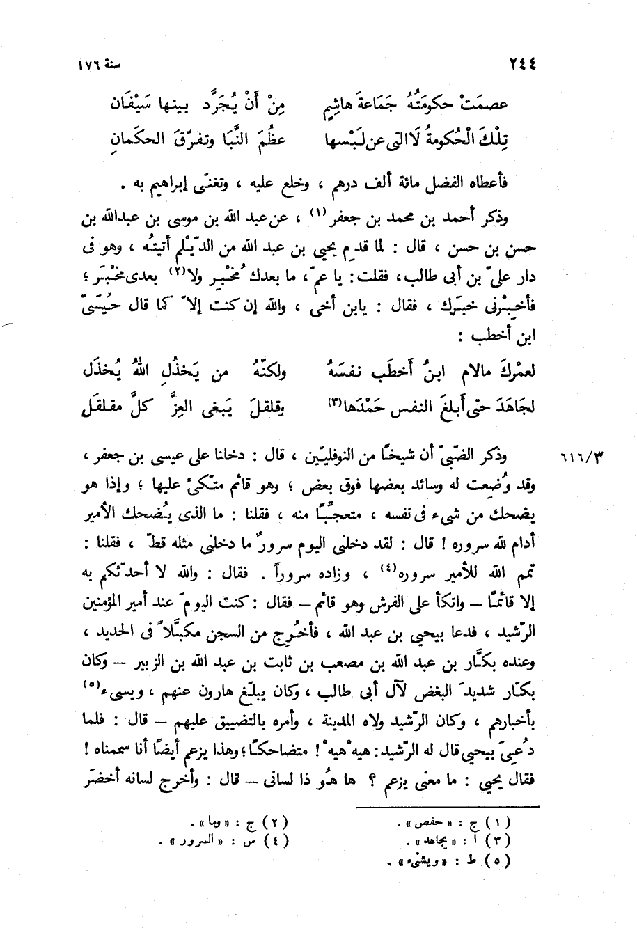 تمم الله للأمير سروره، وزاده سرورا فقال: والله لا أحدثكم به إلا قائما- واتكأ على الفرش وهو قائم- فقال: كنت اليوم عند أمير المؤمنين الرشيد، فدعا بيحيى بْن عبد الله، فأخرج من السجن مكبلا في الحديد، وعنده بكار بْنَ عَبْدِ اللَّهِ بْنِ مُصْعَبِ بْنِ ثَابِتِ بْن عبد الله بْن الزبير- وكان بكار شديد البغض لآل أبي طالب، وكان يبلغ هارون عنهم، ويسيء بأخبارهم، وكان الرشيد ولاه المدينة، وأمره بالتضييق عليهم- قَالَ: فلما دعي بيحيى قَالَ له الرشيد: هيه هيه! متضاحكا، وهذا يزعم أيضا أنا سممناه! فقال يحيى: ما معنى يزعم؟ ها هو ذا لساني- قَالَ: وأخرج لسانه أخضر
