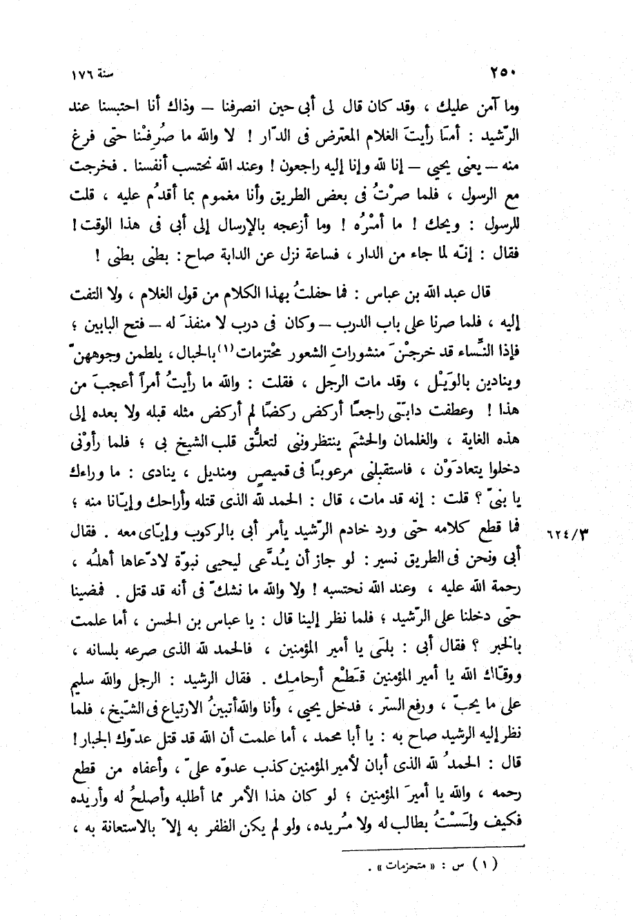 وما آمن عليك، وقد كان قَالَ لي أبي حين انصرفنا- وذاك أنا احتبسنا عند الرشيد: أما رأيت الغلام المعترض في الدار! لا والله ما صرفنا حتى فرغ منه- يعني يحيى- إِنَّا لِلَّهِ وَإِنَّا إِلَيْهِ راجِعُونَ! وعند الله نحتسب أنفسنا فخرجت مع الرسول، فلما صرت في بعض الطريق وأنا مغموم بما أقدم عليه، قلت للرسول: ويحك! ما أمره! وما أزعجه بالإرسال إلى أبي في هذا الوقت! فقال: إنه لما جاء من الدار، فساعة نزل عن الدابة صاح: بطني بطني! قَالَ عبد الله بْن عباس: فما حفلت بهذا الكلام من قول الغلام، ولا التفت إليه، فلما صرنا على باب الدرب- وكان في درب لا منفذ له- فتح البابين، فإذا النساء قد خرجن منشورات الشعور محتزمات بالحبال، يلطمن وجوههن وينادين بالويل، وقد مات الرجل، فقلت: والله ما رأيت أمرا أعجب من هذا! وعطفت دابتي راجعا أركض ركضا لم أركض مثله قبله ولا بعده إلى هذه الغاية، والغلمان والحشم ينتظرونني لتعلق قلب الشيخ بي، فلما رأوني دخلوا يتعادون، فاستقبلني مرعوبا في قميص ومنديل، ينادي: ما وراءك يا بني؟ قلت: إنه قد مات، قَالَ: الحمد لله الذي قتله وأراحك وإيانا منه، فما قطع كلامه حتى ورد خادم الرشيد يأمر أبي بالركوب وإياي معه فقال أبي ونحن في الطريق نسير: لو جاز أن يدعى ليحيى نبوة لادعاها أهله، رحمة الله عليه، وعند الله نحتسبه! ولا والله ما نشك في أنه قد قتل فمضينا حتى دخلنا على الرشيد، فلما نظر إلينا قَالَ: يا عباس بْن الحسن، أما علمت بالخبر؟ فقال أبي: بلى يا أمير المؤمنين، فالحمد لله الذي صرعه بلسانه، ووقاك الله يا أمير المؤمنين قطع أرحامك فقال الرشيد: الرجل والله سليم على ما يحب، ورفع الستر، فدخل يحيى، وأنا والله أتبين الارتياع في الشيخ، فلما نظر إليه الرشيد صاح به: يا أبا محمد، أما علمت أن الله قد قتل عدوك الجبار! قَالَ: الحمد لله الذي أبان لأمير المؤمنين كذب عدوه علي، وأعفاه من قطع رحمه، والله يا أمير المؤمنين، لو كان هذا الأمر مما أطلبه وأصلح له وأريده فكيف ولست بطالب له ولا مريده، ولو لم يكن الظفر به إلا بالاستعانة به،
