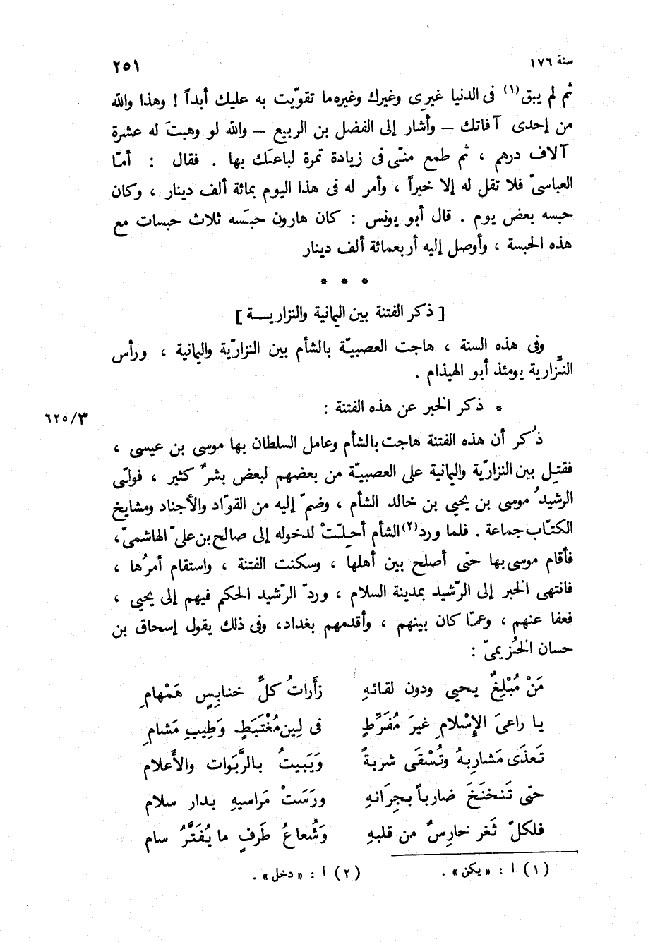 ذكر أن هذه الفتنة هاجت بالشام وعامل السلطان بها موسى بْن عيسى، فقتل بين النزارية واليمانية على العصبية من بعضهم لبعض بشر كثير، فولى الرشيد موسى بْن يحيى بْن خالد الشام، وضم إليه من القواد والأجناد ومشايخ الكتاب جماعة فلما ورد الشام أحلت لدخوله إلى صالح بْن علي الهاشمي، فأقام موسى بها حتى أصلح بين أهلها، وسكنت الفتنة، واستقام أمرها، فانتهى الخبر إلى الرشيد بمدينة السلام، ورد الرشيد الحكم فيهم إلى يحيى، فعفا عنهم، وعما كان بينهم، وأقدمهم بغداد، وفي ذلك يقول إسحاق بن حسان الخزيمي: