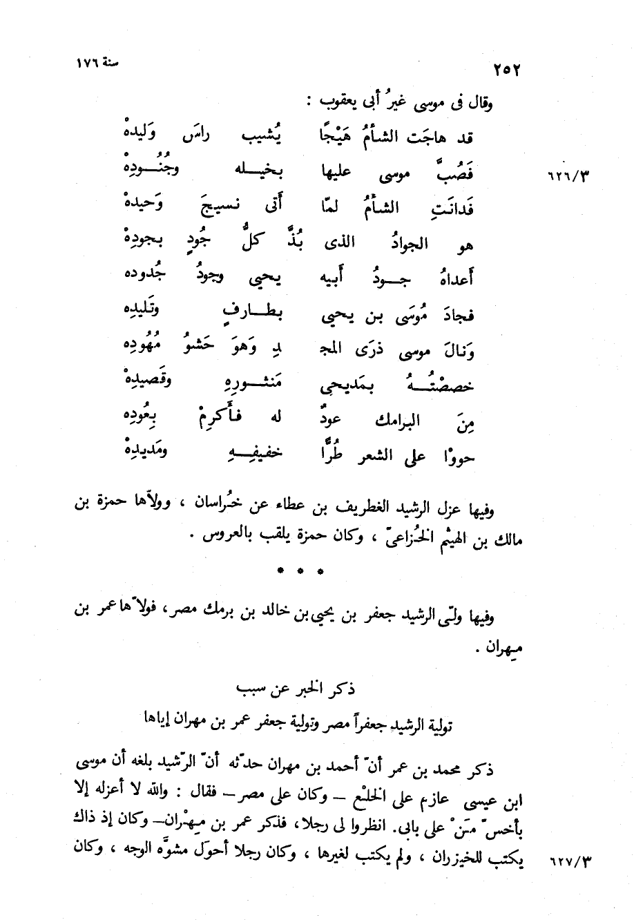وفيها ولى الرشيد جعفر بْن يحيى بْن خالد بْن برمك مصر، فولاها عمر بْن مهران.