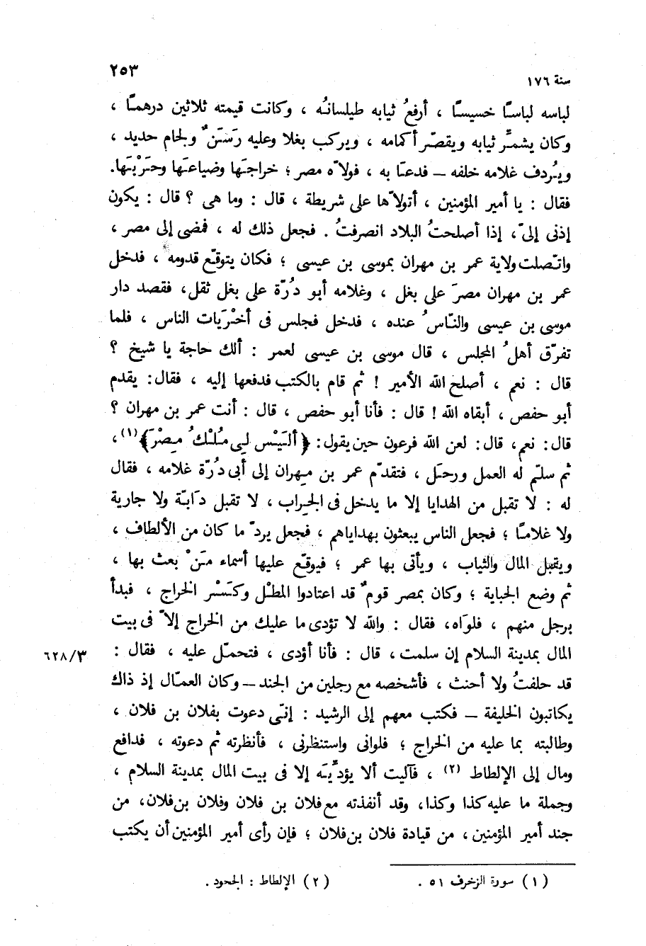 قَالَ: نعم، قَالَ: لعن الله فرعون حين يقول: «أَلَيْسَ لِي مُلْكُ مِصْرَ «، ثم سلم له العمل ورحل، فتقدم عمر بْن مهران إلى أبي درة غلامه، فقال له: لا تقبل من الهدايا إلا ما يدخل في الجراب، لا تقبل دابة ولا جارية ولا غلاما، فجعل الناس يبعثون بهداياهم، فجعل يرد ما كان من الألطاف، ويقبل المال والثياب، ويأتي بها عمر، فيوقع عليها أسماء من بعث بها، ثم وضع الجباية، وكان بمصر قوم قد اعتادوا المطل وكسر الخراج، فبدأ برجل منهم، فلواه، فقال: والله لا تؤدي ما عليك من الخراج إلا في بيت المال بمدينة السلام إن سلمت، قَالَ: فأنا أؤدي، فتحمل عليه، فقال: