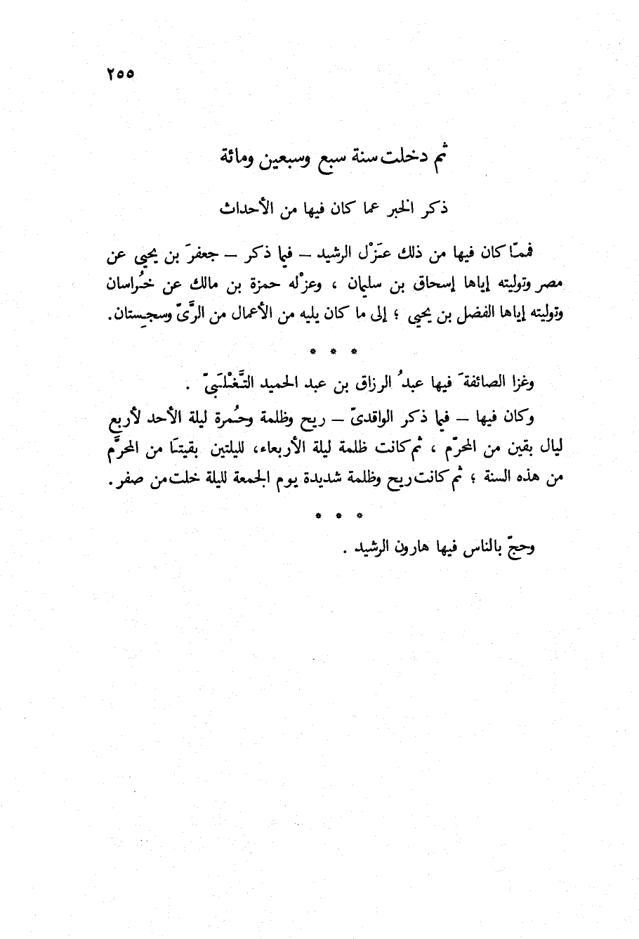 (ذكر الخبر عما كَانَ فِيهَا من الأحداث) فمما كان فيها من ذلك عزل الرشيد- فيما ذكر- جعفر بْن يحيى عن مصر وتوليته إياها إسحاق بْن سليمان، وعزله حمزة بْن مالك عن خراسان وتوليته إياها الفضل بْن يحيى، إلى ما كان يليه من الاعمال من الري وسجستان.