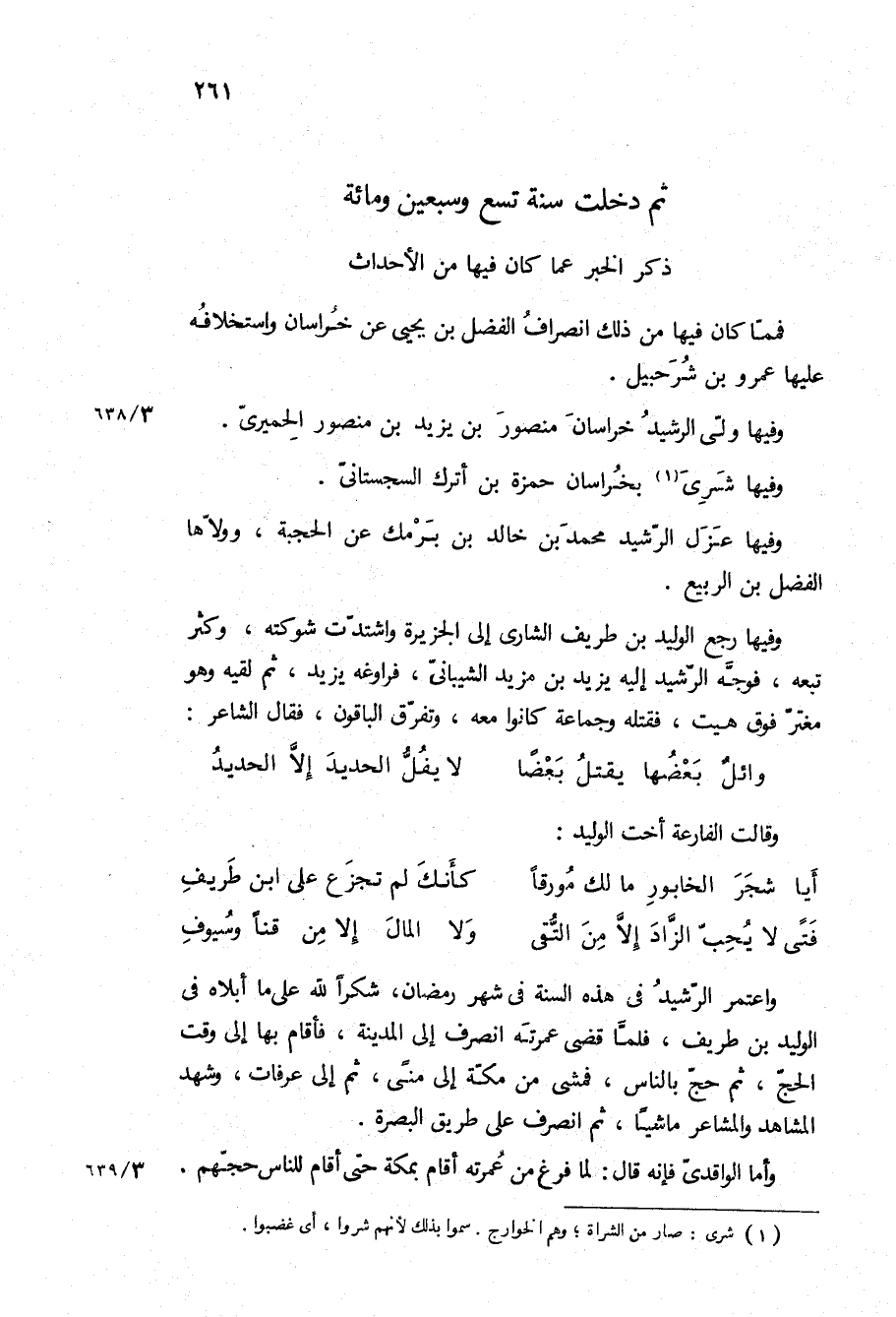 وفيها رجع الوليد بْن طريف الشاري إلى الجزيرة واشتدت شوكته، وكثر تبعه، فوجه الرشيد إليه يزيد بْن مزيد الشيبانى، فراوغه يزيد، ثم لقيه وهو مغتر فوق هيت، فقتله وجماعة كانوا معه، وتفرق الباقون، فقال الشاعر: