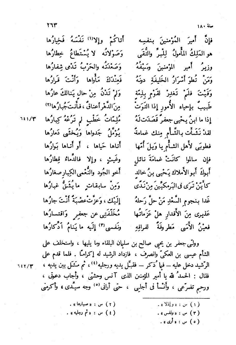 وولى جعفر بْن يحيى صالح بْن سليمان البلقاء وما يليها، واستخلف على الشام عيسى بْن العكي وانصرف، فازداد الرشيد له إكراما فلما قدم على الرشيد دخل عليه- فيما ذكر- فقبل يديه ورجليه، ثم مثل بين يديه، فقال: الحمد لله يا أمير المؤمنين الذي أنس وحشتي، وأجاب دعوتي، ورحم تضرعي، وأنسأ في أجلي، حتى أراني وجه سيدي، وأكرمني