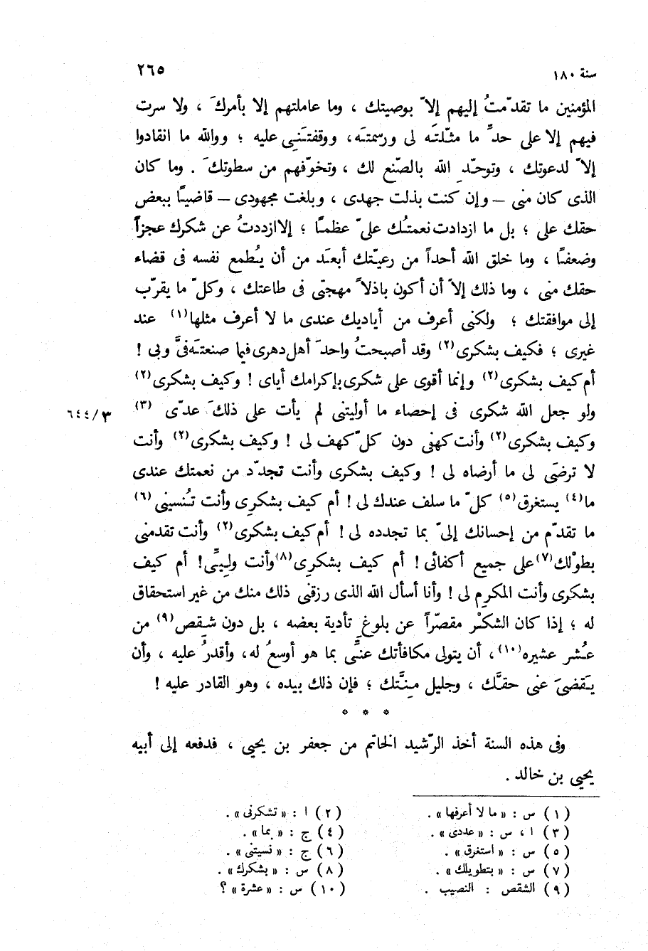 المؤمنين ما تقدمت إليهم إلا بوصيتك، وما عاملتهم إلا بأمرك، ولا سرت فيهم إلا على حد ما مثلته لي ورسمته، ووقفتنى عليه، وو الله ما انقادوا إلا لدعوتك، وتوحد الله بالصنع لك، وتخوفهم من سطوتك وما كان الذي كان منى- وان كنت بذلت جهدي، وبلغت مجهودي- قاضيا ببعض حقك علي، بل ما ازدادت نعمتك علي عظما، إلا ازددت عن شكرك عجزا وضعفا، وما خلق الله أحدا من رعيتك أبعد من أن يطمع نفسه في قضاء حقك مني، وما ذلك إلا أن أكون باذلا مهجتي في طاعتك، وكل ما يقرب إلى موافقتك، ولكني أعرف من أياديك عندي ما لا أعرف مثلها عند غيري، فكيف بشكري وقد أصبحت واحد أهل دهري فيما صنعته في وبي! أم كيف بشكري وإنما أقوى على شكرى بإكرامك إياي! وكيف بشكري ولو جعل الله شكري في إحصاء ما أوليتني لم يأت على ذلك عدي وكيف بشكري وأنت كهفي دون كل كهف لي! وكيف بشكري وأنت لا ترضى لي ما أرضاه لي! وكيف بشكري وأنت تجدد من نعمتك عندي ما يستغرق كل ما سلف عندك لي! أم كيف بشكري وأنت تنسيني ما تقدم من إحسانك إلي بما تجدده لي! أم كيف بشكري وأنت تقدمني بطولك على جميع أكفائي! أم كيف بشكري وأنت وليي! أم كيف بشكري وأنت المكرم لي! وأنا أسأل الله الذي رزقني ذلك منك من غير استحقاق له، إذا كان الشكر مقصرا عن بلوغ تأدية بعضه، بل دون شقص من عشر عشيره، أن يتولى مكافأتك عني بما هو أوسع له، واقدر عليه، وان يقضى عنى حقك، وجليل منتك، فإن ذلك بيده، وهو القادر عليه! وفي هذه السنة أخذ الرشيد الخاتم من جعفر بْن يحيى، فدفعه إلى أبيه يحيى بْن خالد